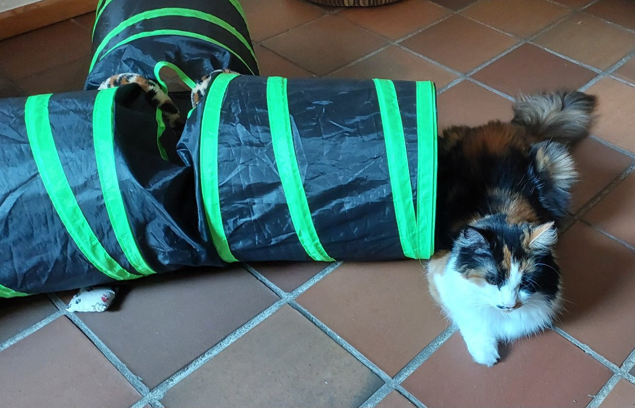 Nun wird drinnen mal wieder der Spieltunnel bearbeitet. Hach, bin ich glücklich, dass es ihr wieder gut geht.