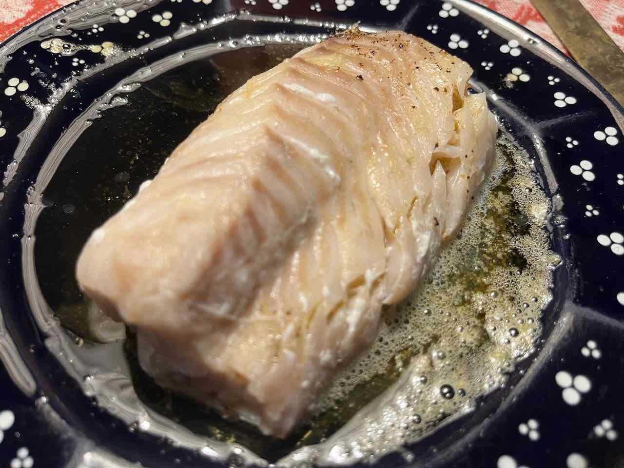 Kabeljaufilet über Fischfond und Weißwein mit Knoblauch und Lorbeerblättern gedämpft und mit Limettensaft und geschmolzener Butter übergossen sowie Tiefkühl-Blattspinat gebraten und mit Ingwer, Curry und Kreuzkümmel gewürzt zum Rkatsiteli 2018 aus Georgien