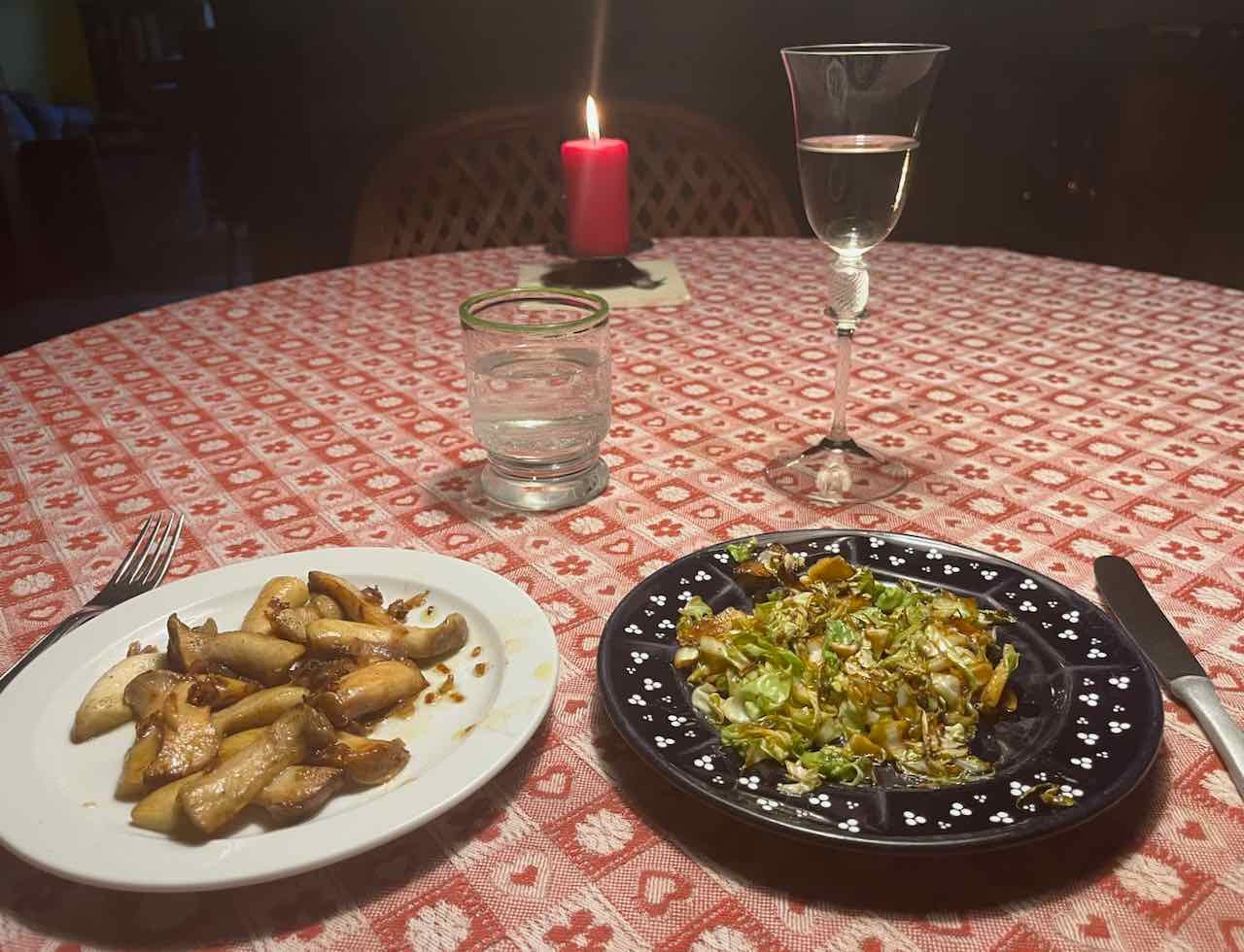 Spitzkohl mit französischer Salzbutter und Sojasoße gebraten sowie Kräutersaitlinge spanisch mit Schalotten und Knoblauch gebraten und mit spanischem weißem Balsamico abgelöscht zum "Reichensteiner" 2024 aus der Schweiz