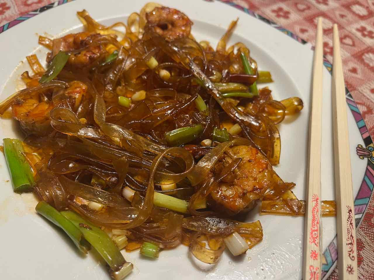 Gebratene breite Glasnudeln und argentinische Rotgarnelen mit Frühlingszwiebeln, Ingwer und Chili in Austernsoße, etwas Sesamöl und Limettensaft zum Châteauneuf du Pape 2012