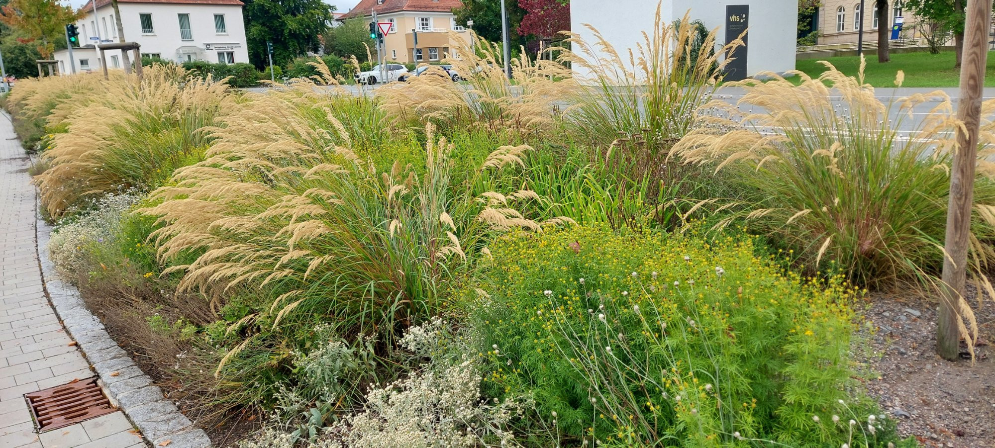 In Kronach habe ich an öffentliche Beeten, Strassenpflanzungen an klima angepasste überwiegend trockenheitsresistente Staudenpflanzungen gesehen. Teil. angewachsene Beete, oder auch Neupflanzungen.