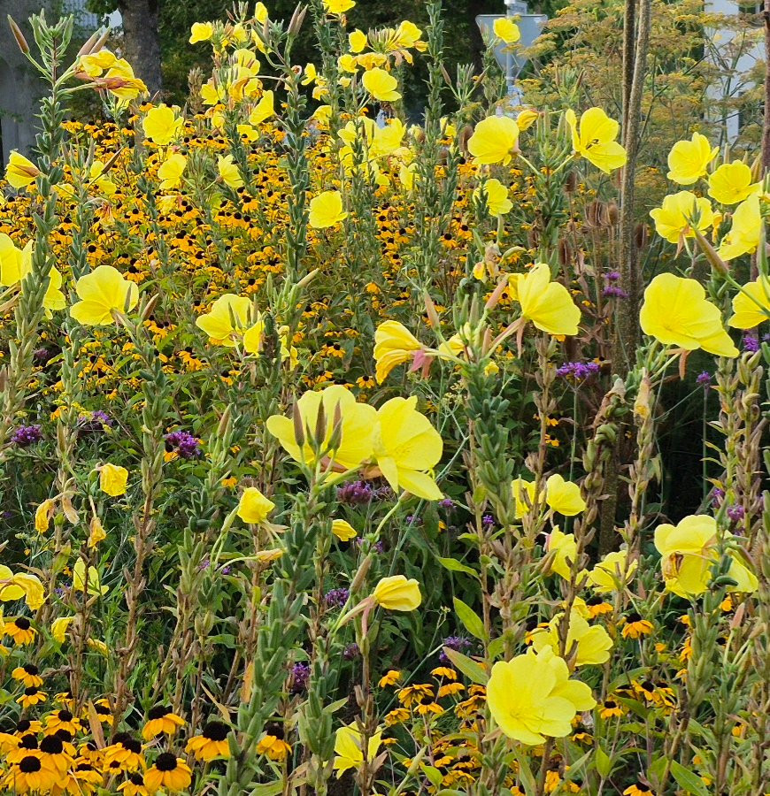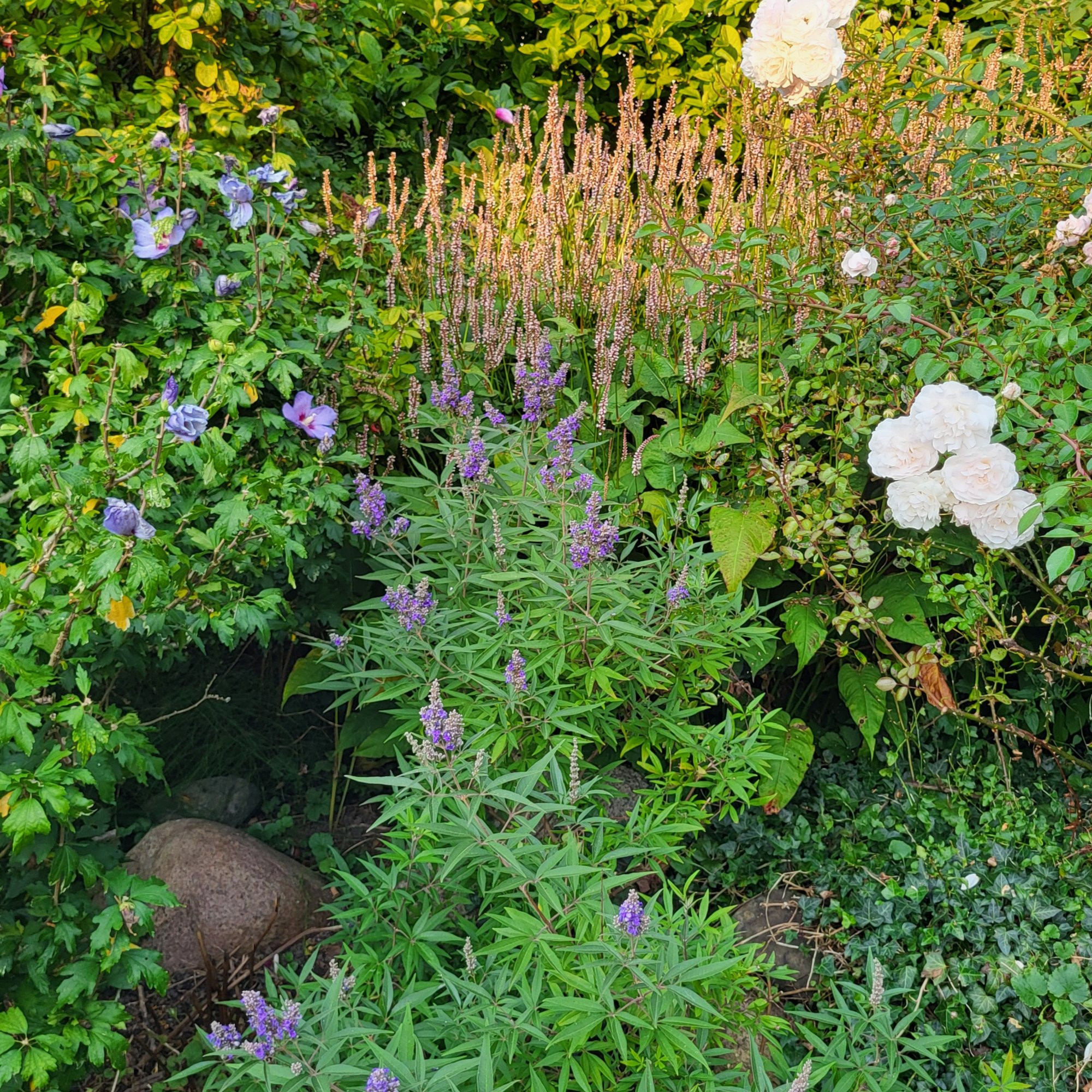 Vielleicht eine etwas seltsame Kombination: Beginnender Vitex mit schon lange blühendem Kerzenknöterich, Bistorta amplexicaulis.
