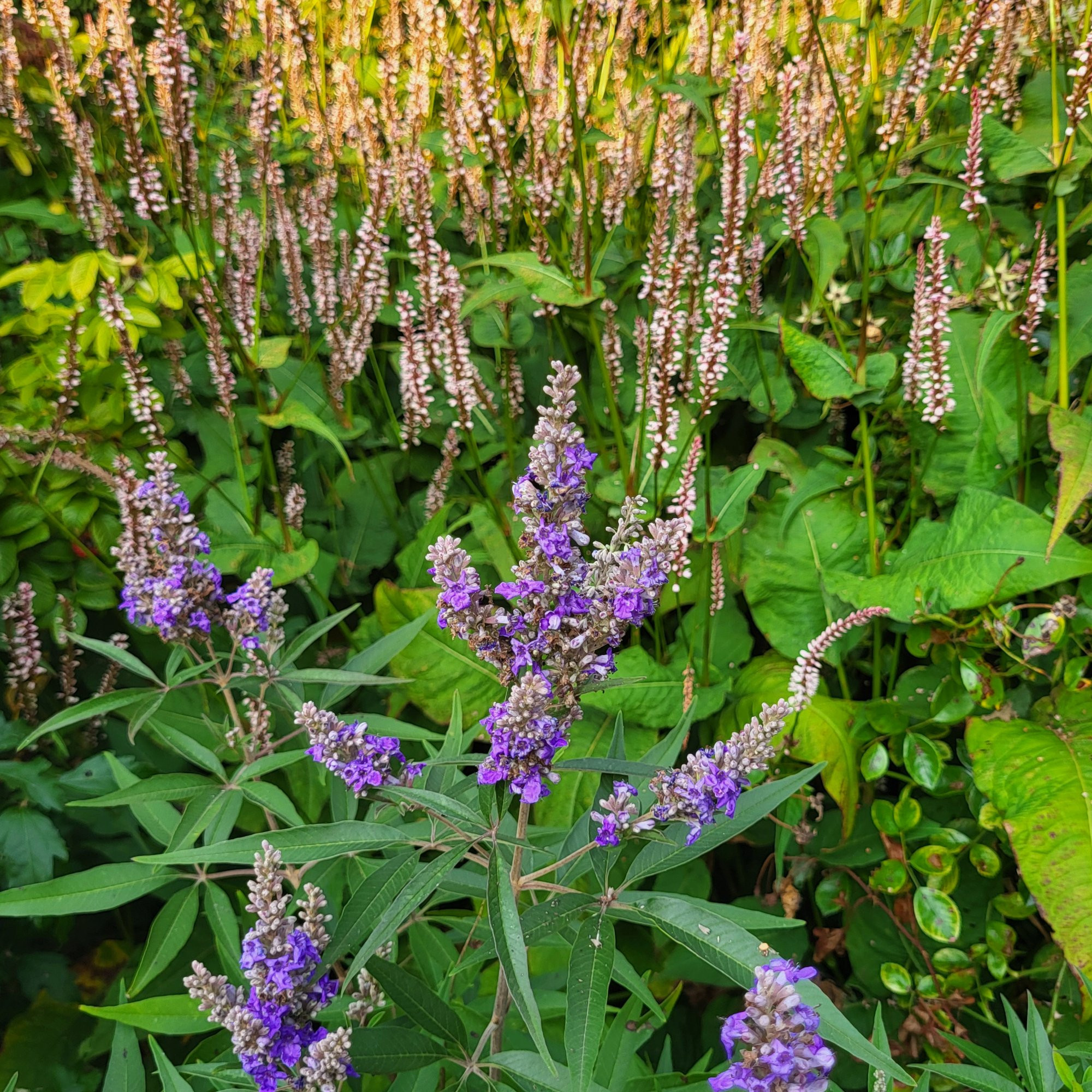 Vielleicht eine etwas seltsame Kombination: Beginnender Vitex mit schon lange blühendem Kerzenknöterich, Bistorta amplexicaulis.