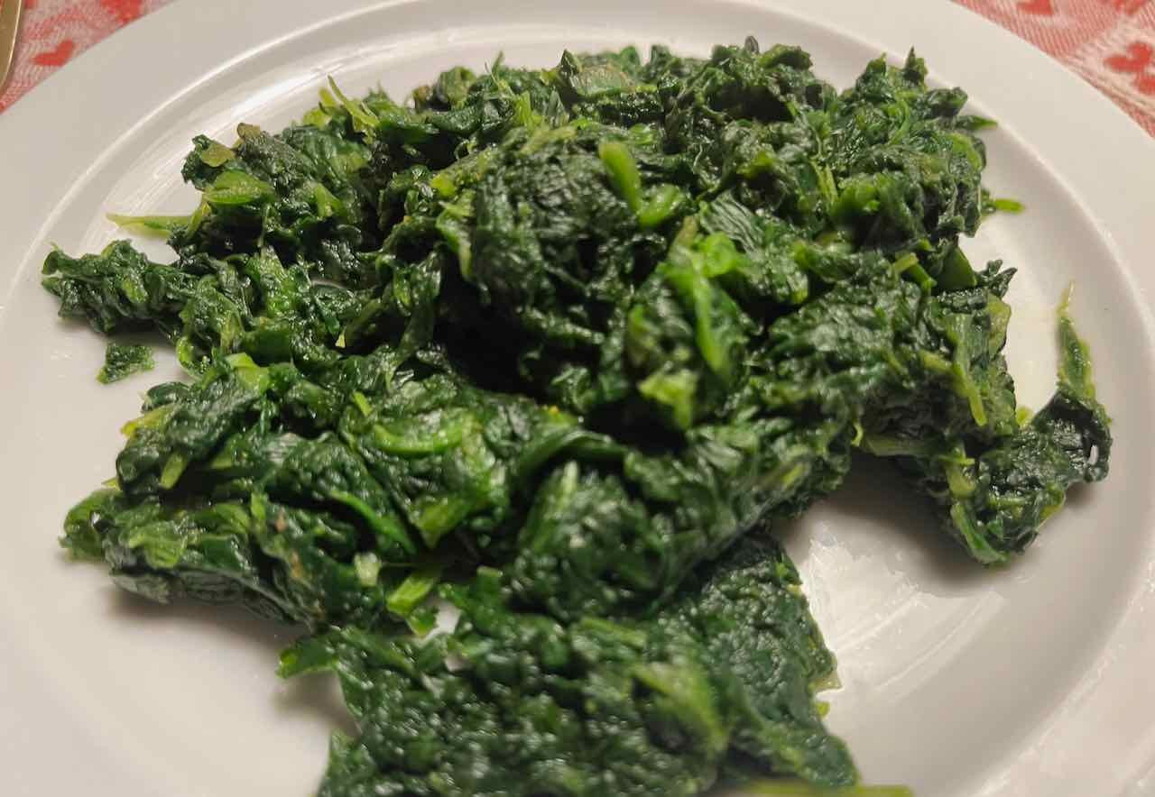 Kabeljaufilet über Fischfond und Weißwein mit Knoblauch und Lorbeerblättern gedämpft und mit Limettensaft und geschmolzener Butter übergossen sowie Tiefkühl-Blattspinat gebraten und mit Ingwer, Curry und Kreuzkümmel gewürzt zum Rkatsiteli 2018 aus Georgien