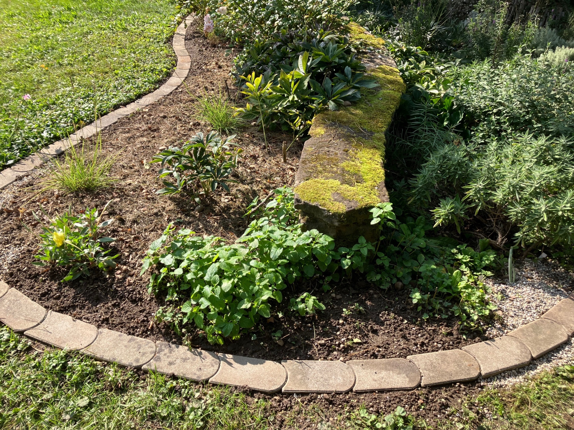 Wenn ich wieder mal ganz viel Schub bekomme, lege ich noch Granitplatten über die Rasenkante. Das habe ich bei einem Nelkenbeet gemacht, sieht richtig gut aus und ich kann drüber mähen. Die Granitplatten (unregelmässige) habe ich von der alten Terrasse behalten, extra für solche Gartenarbeiten. Das Fundament hatte sich in Sand aufgelöst und alle Platten wackelten, die meisten konnte man einfach so abnehmen.