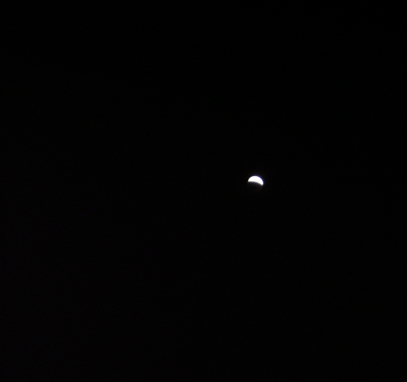Vor wenigen Minuten hat die Mondfinsternis begonnen, ich hab Glück, es hat nur wenige Wolken am Himmel, jetzt liegt gerade eine kliene davor.