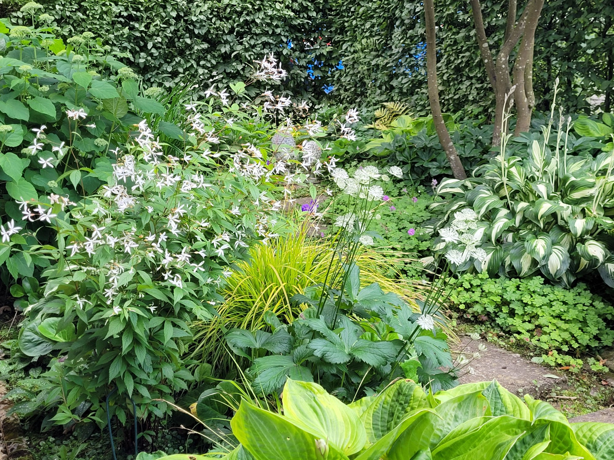 Dazu würden z. B. passen: Aquilegia, Hakonechloa macra, Hosta, Astrantia, Carex...
