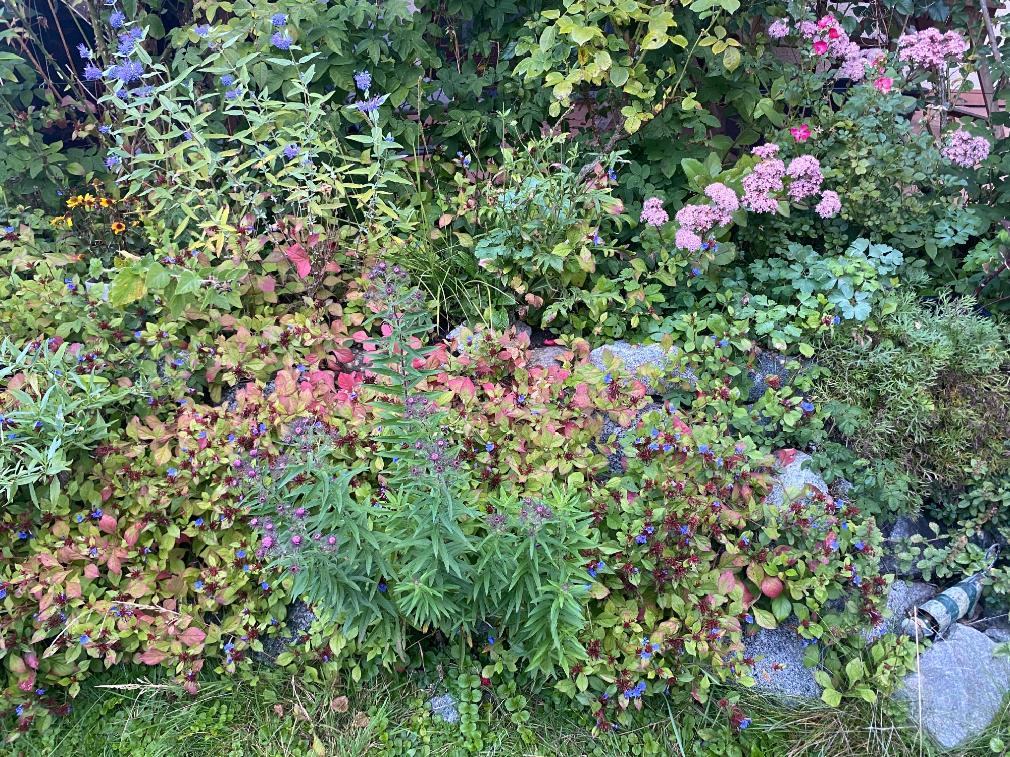 Ein Wucherer, den ich nicht mehr pflanzen würde, trotz der netten Blüten und schönen Herbstfärbung, ist Ceratostigma Plumbaginoides. Sie erobert immer mehr von der geschlichteten Granitsteinmauer; um sie zu reduzieren, müsste ich die Steine abbauen, damit ich an die Ausläufer komme.