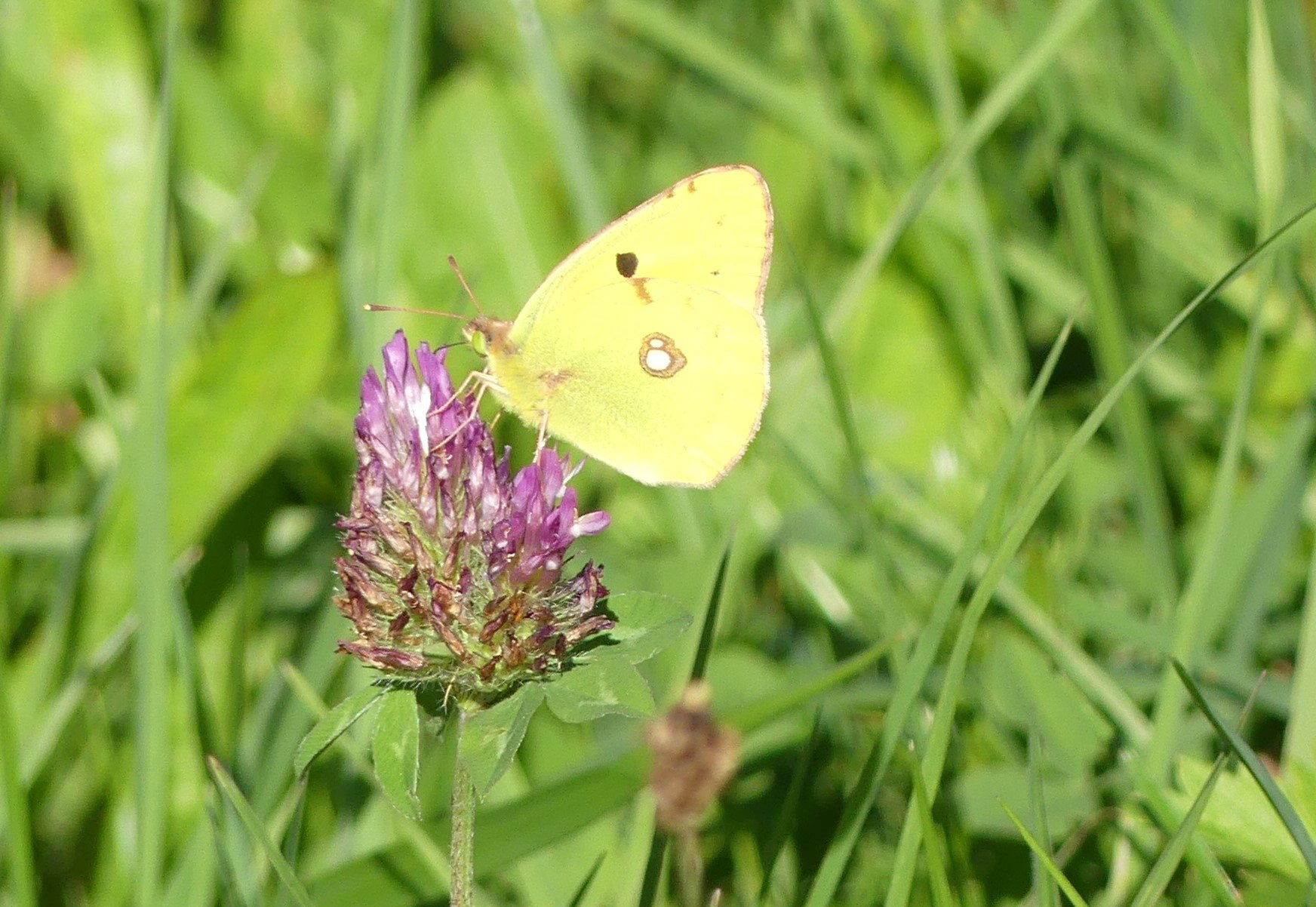 Und in der Heuwiese waren drei Postillon, Colias crocea. Diese Wandergelblinge sehe ich hier sonst hauptsächlich im Herbst in warm-trockenen Jahren, wie auch ihr Lebensraum eher in trocken-warmen Gegenden liegt. Im August war auch schon einer da, überraschender Weise habe ich zu der Zeit auch in Alpennähe im Wertachtal zwei gesehen.