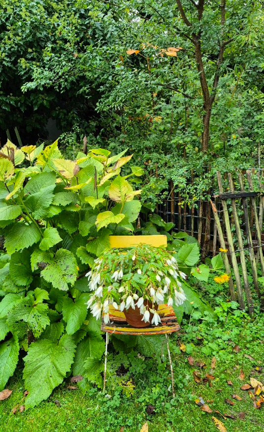 Meinen zweiten 'Bi-hoo' habe ich in eine Ecke auf der Nordseite des Hauses gestellt, hier bekommt er nur morgens Sonne, und auch hier ist da Laub prächtig goldgelb. Funkien, Hakonechloa und die Kletterhortensie färben nun auch und hellen diese an trüben Tagen eher dunkle Ecke auf. Auf dem Pflaster sieht man deutlich, dass es bei trübem, regnerischen Wetter zumindest im Winterhalbjahr tagelang nass ist, selbst das Pflaster kann kaum abtrocknen und zeigt einen üppigen Moosbewuchs. Gelegentlich muss ich hier den Weg schrubben, damit er nicht zu glitschig wird, aber ich bin froh, dass man hier nun relativ gefahrlos gehen kann, denn als das früher noch eine wilde Ecke mit etwas Grasbewuchs war, bin ich mehr als einmal auf dem Hosenboden gelandet...