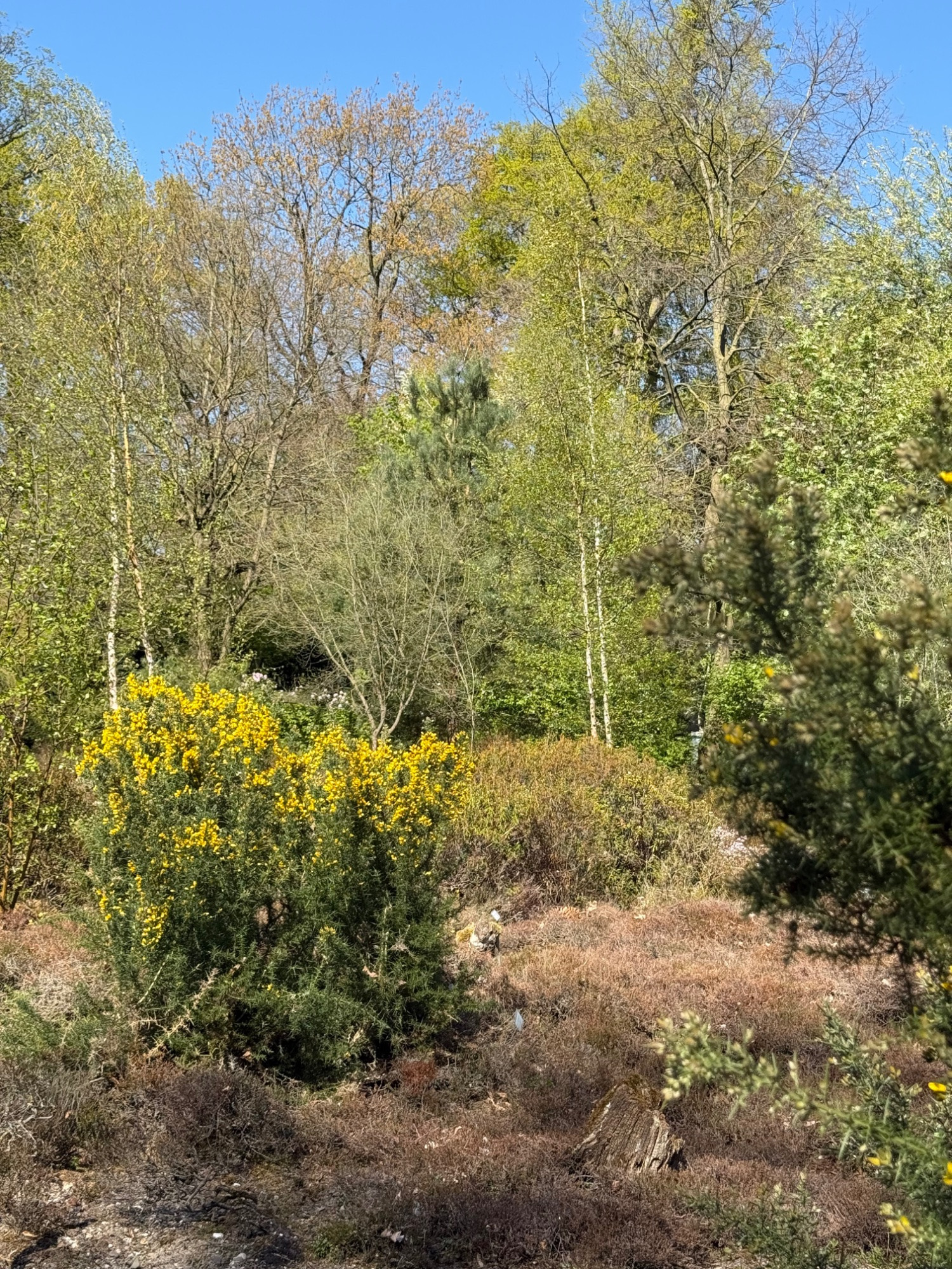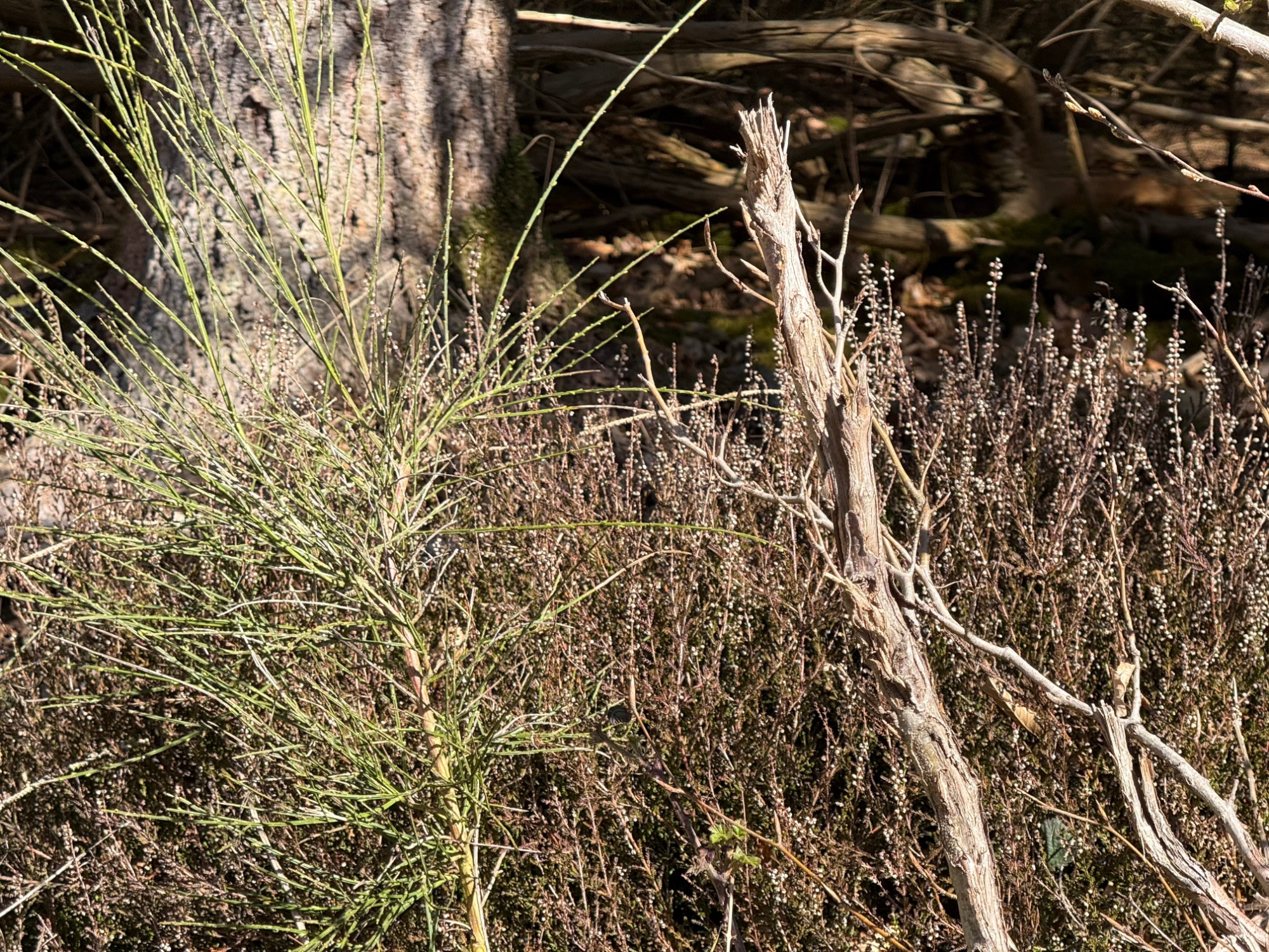 Am naturstandort am Gehölzrand kann man tatsächlich den Besenginster direkt am Stamm einer Fichte wachsen sehen hier zusammen mit Calluna und Salbei gamander: