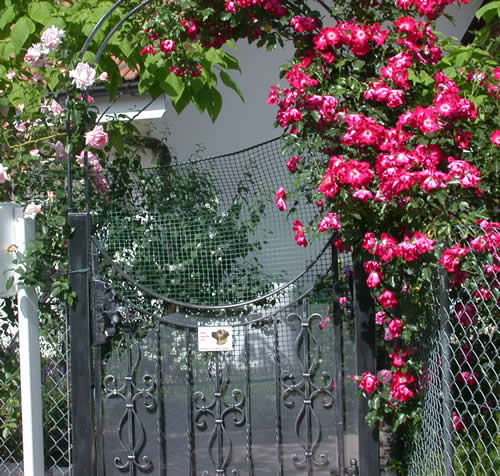 sonnenschein kennt unsere Problemlösung: E.- Zaun! Zeitweilig hatten wir drei Hündinnen im Haus, ständig kam ungebetener Rüdenbesuch. Als dann noch unser HSH am Zaun "aufbaumte", haben wir einen Weidezaun gespannt- seitdem ist Ruhe auf der ganzen Linie. Kein Besuch mehr, keine Ausbruchsversuche, kein Hochspringen!Weidezäune gibt es im Fachhandel in unterschiedlichen Komplettangeboten. Unsere Hunde hatten schon auf Spaziergängen unliebsame Bekanntschaft mit diesen Zäunen gemacht. Die alte, erfahrene Hündin ging nie auch nur in die Nähe der gespannten Litze, lag sie auf dem Boden, stieg sie seelenruhig darüber _ kein Strom. Shara war etwas ungläubiger und musste den Zaun erkunden, gleiches Resultat!. Seitdem ist der Strom monatelang abgeschaltet, nur wenn Shara läufig ist, wird wieder eingeschaltet.An der Pforte hängt eine "blinde" Litze, dort war noch nie Strom! Sie springt nicht mehr an der Pforte hoch. Da auch andere Hunde die gleichen Erfahrungen auf Spaziergängen gemacht haben, respektieren sie diese Zäune ebenfalls. Sie könnten mit Leichtigkeit übersprungen werden, die Hunde tun es nicht, sie wissen nur, dass das "Schlägelchen" von dem Draht kommt, aber wie ?Shara geht nicht einmal über eine liegende Litze. Es können hinter dem Zaun "Intimfeinde" sein, die Hunde gehen nicht darüber. Zeit zum Installieren bei etwa 40 Metern eine halb Stunde, Kosten ungefähr 100 €, von gelegentlichen Stromkosten abgesehen.