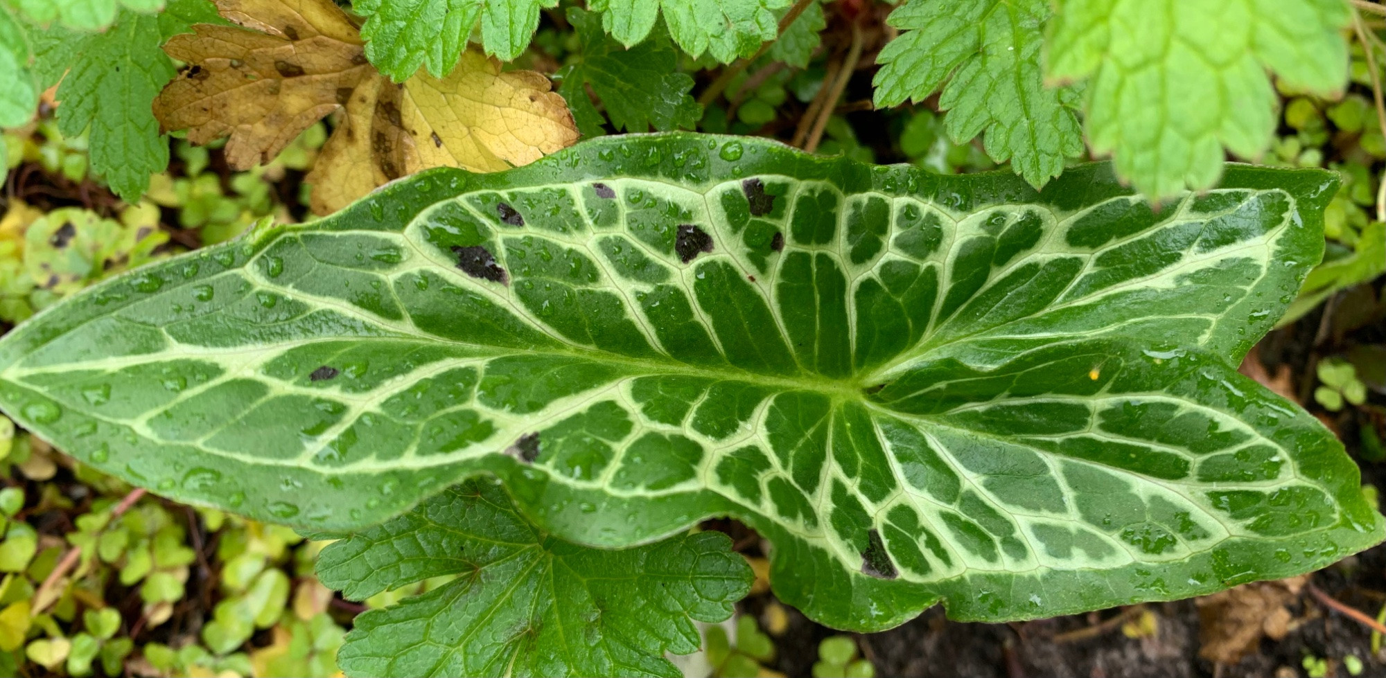 Besonders gefallen mir Arum italicum, weil die Blätter schon im Herbst erscheinen. Es gibt eine reichliche Auswahl mit Musterung, mit und ohne schwarze Punkte und auch ganz grüne. Sie benötigen den entsprechenden Hofstaat, um König über den Winter zu sein.