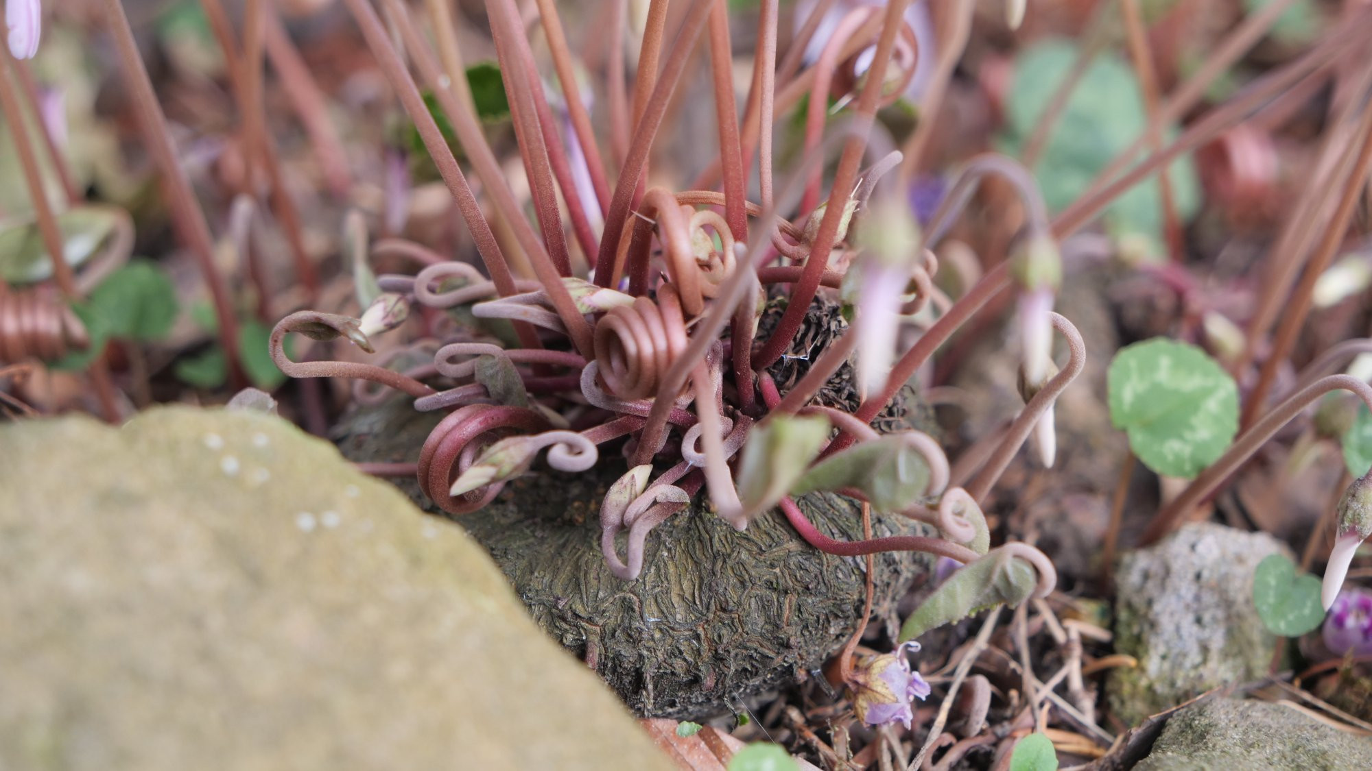 Wegräumen kann ich nicht wirklich, ich versuche es vorsichtig mit einem Gummirechen oder auch den Fingern, wenn es gar zu viel wird. Das meiste bleibt zwischen dem Cyclamenlaub liegen, scheint die C. nicht besonders zu stören