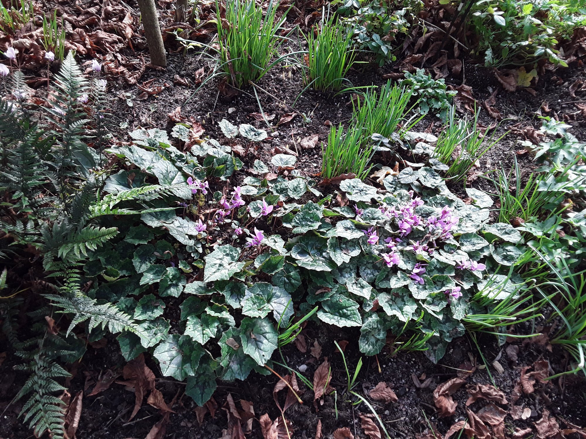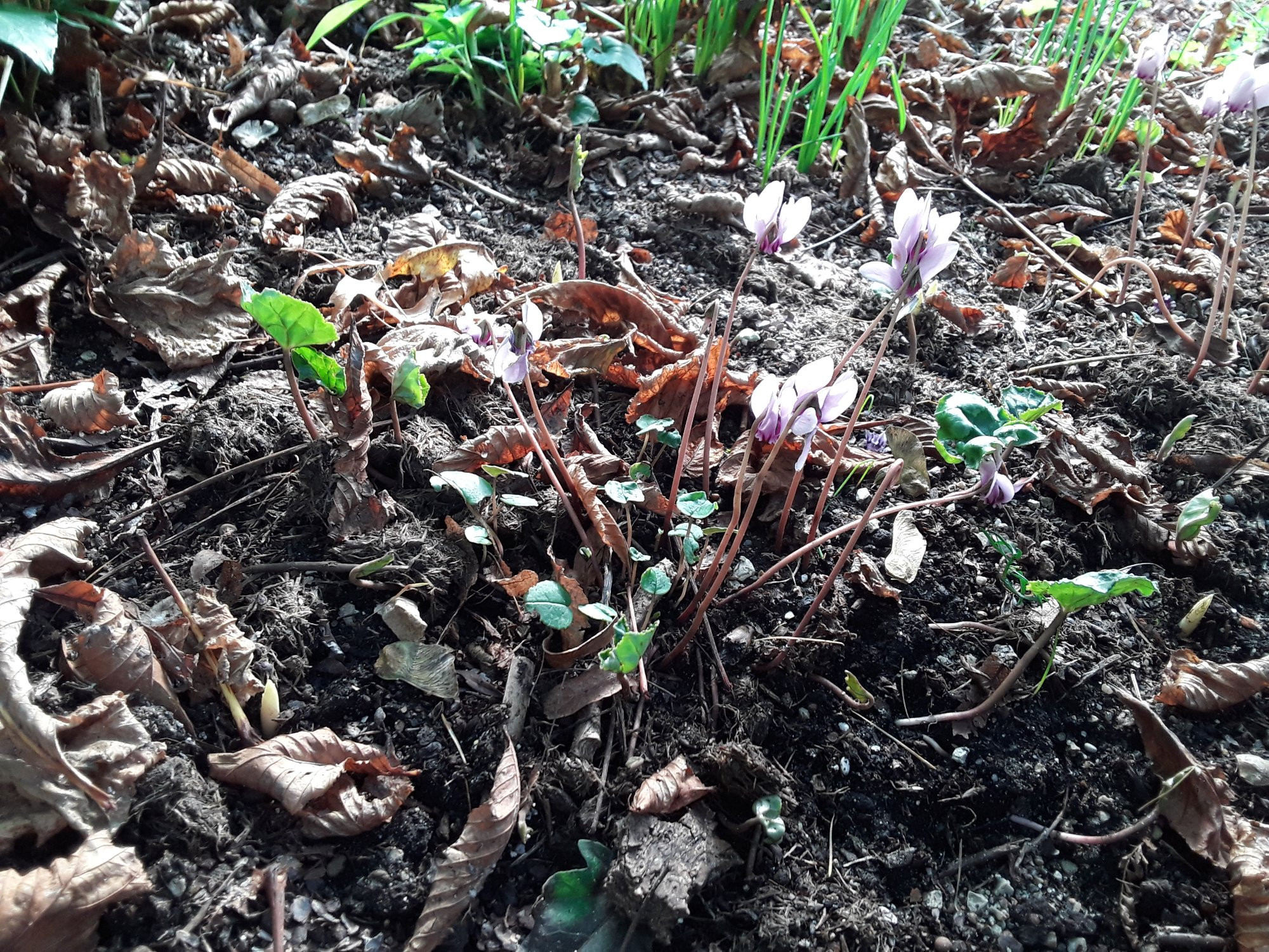 Oh, danke. Da herrscht schon Durcheinander, aber ich habe immer mehrere einer Sorte zusammen gesetzt, also mehrere normalblättrige dunkelrot blühende, Silberblätter, Pfeilblätter. Oder halt eine Reihe mit Confusum oder Crassifolium. Von den Coum kommen noch welche und auch die Confusum zeigen sich noch kaum.