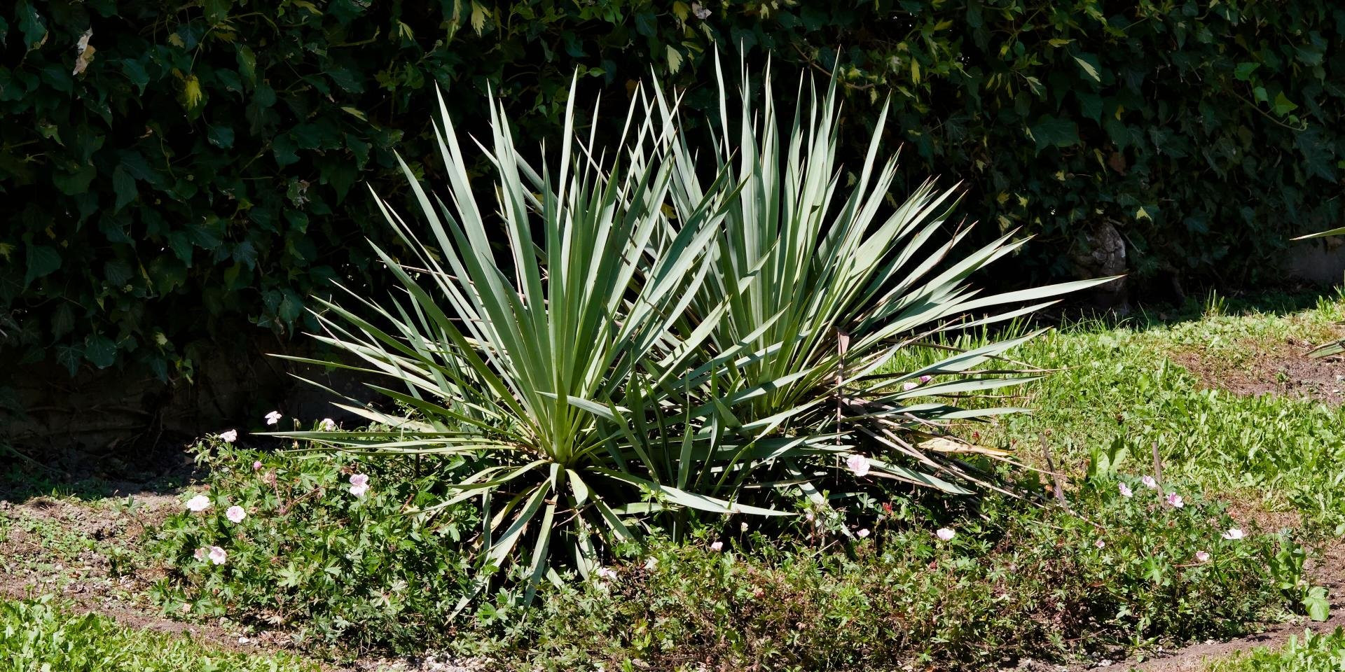 Hier siehst du Yucca recurvifolia x karlsruhensis mit Geranium sanguineum var 'striatum Apfelblüte'. Die Apfelblüte wurde vor 2 Jahren gesetzt. Es gibt hier dunklen Hintergrund, in die andere Richtung ist es weiß.