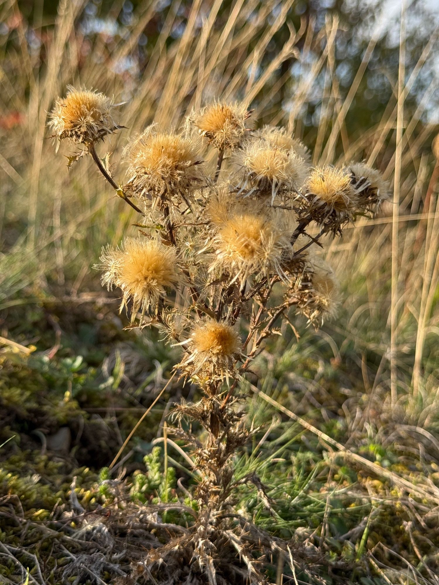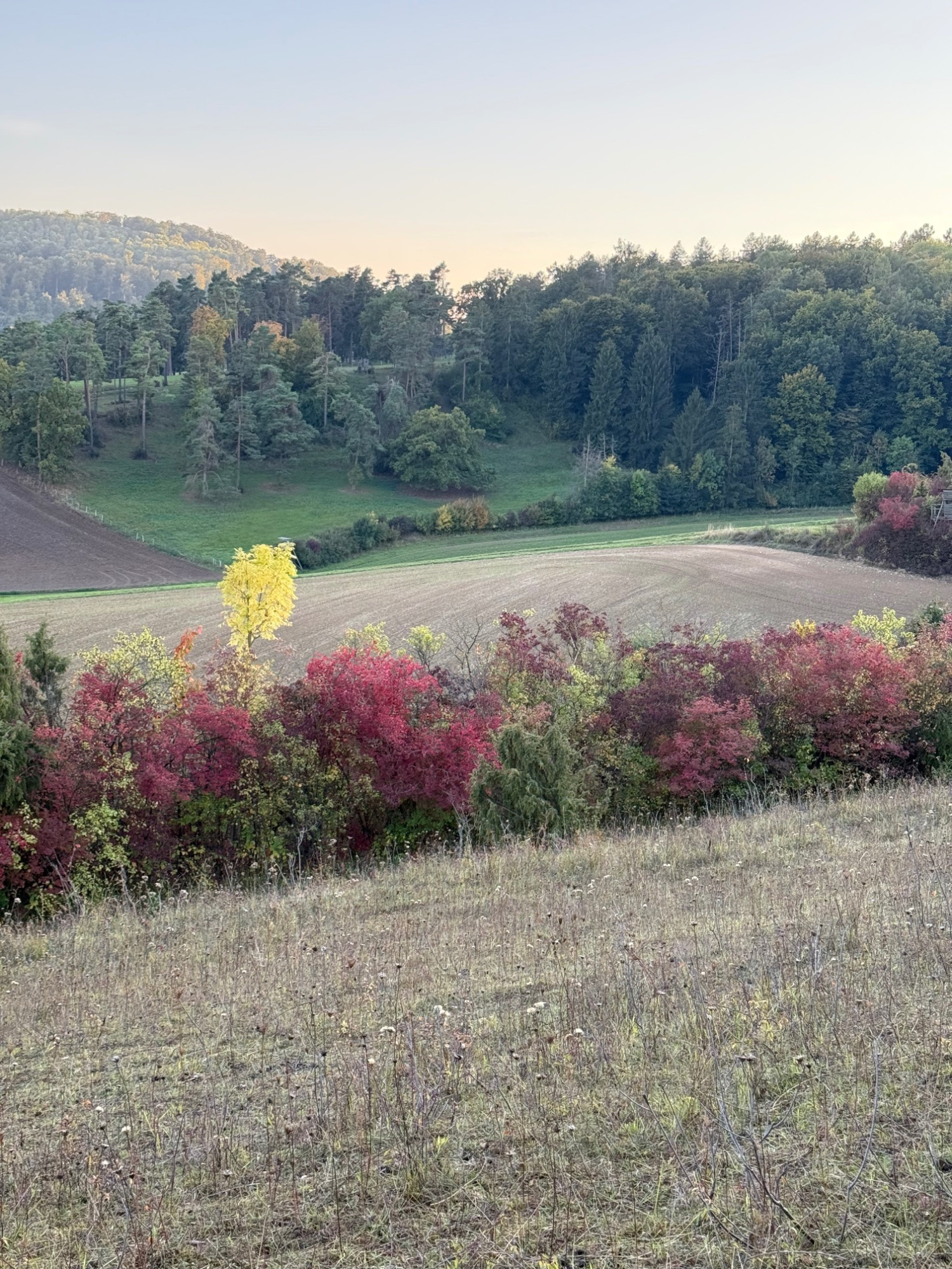 Die ersten Gehölze laufen schon auf Hochtouren und färben schön wie cornus sanguinea: Das fahle Gelb der Esche zusammen mit den roten Blättern des roten Hartriegel ergibt einen schönen Kontrast Die Samenstände der goldistel fangen das warme Licht des des Oktobers gut ein: