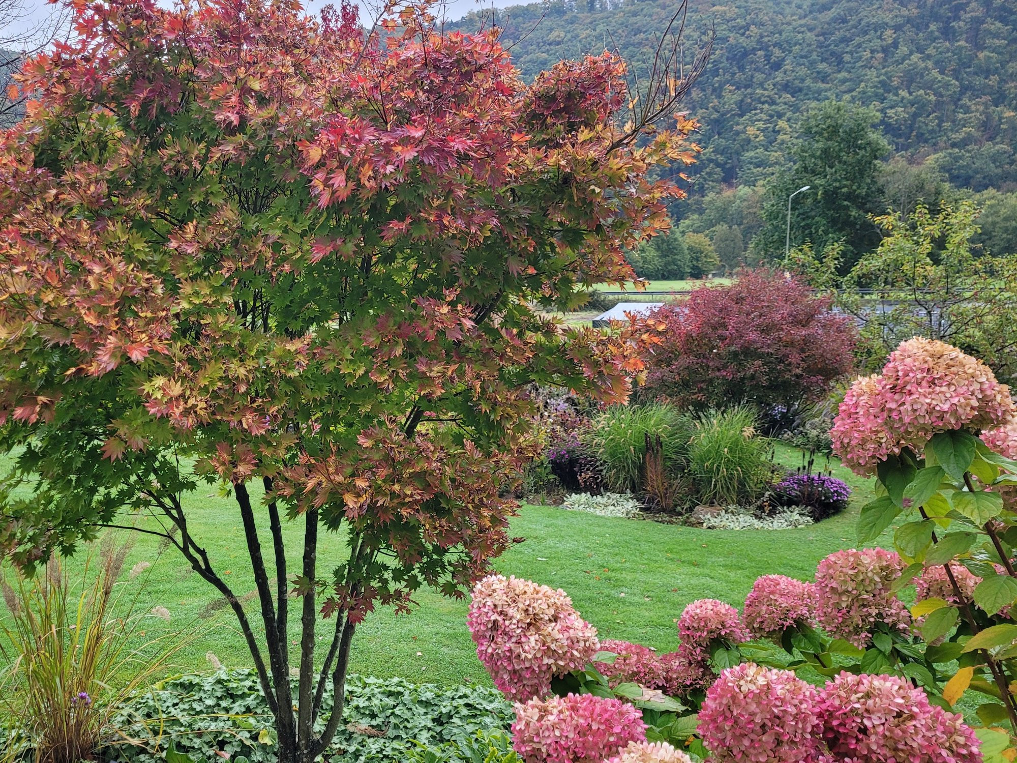 @Buddelkönigin: Mein kleiner 'Jordan' hat bisher auch nur an den Blatträndern einen Anflug von Rot, ansonsten ist das Laub noch Grün. Die aktuelle Färbung bei den trüben Wetter passt wenigstens gut zu den Hortensien.