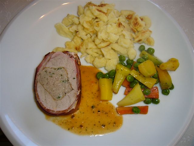 Heute gab es:BlattsalatSchweinsfilet gefüllt, Knöpfli, GemüseZimteis mit lauwarmen Zwetschgen
