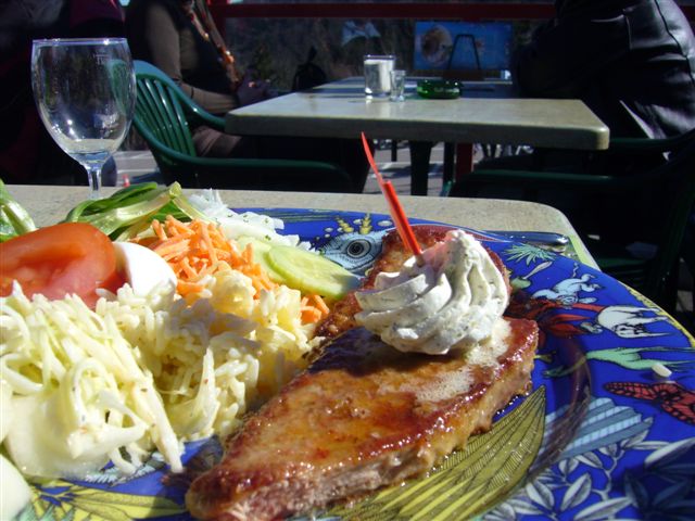 Heute gab es auf der Terrasse eines Bergrestaurants 960 m.ü.M. Kalbsschnitzel mit Salat