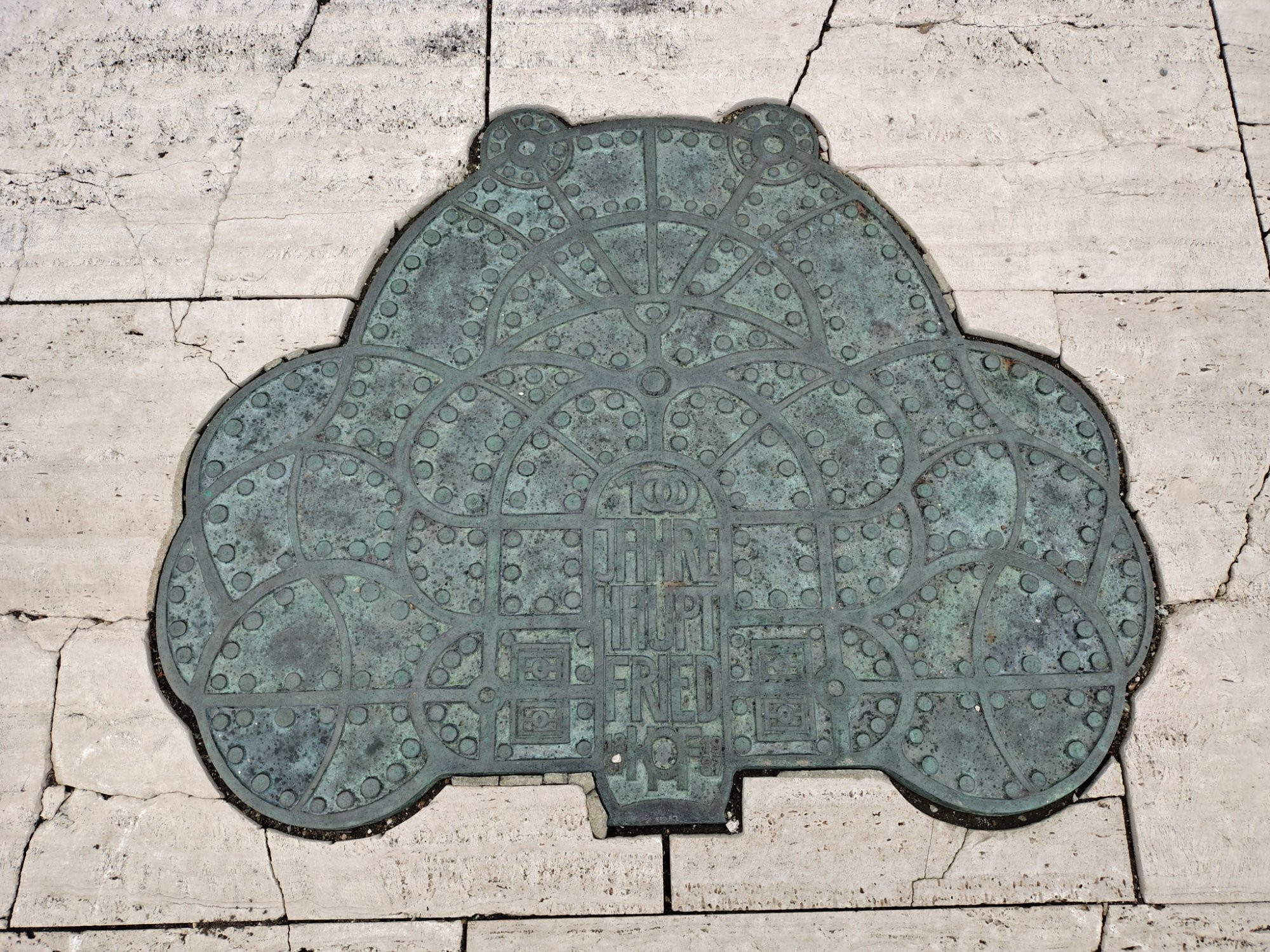 Die Bronzetafel ist im Fußboden vor der Kirche eingelassen und zeigt den ursprünglichen Grundriß des Friedhofs.