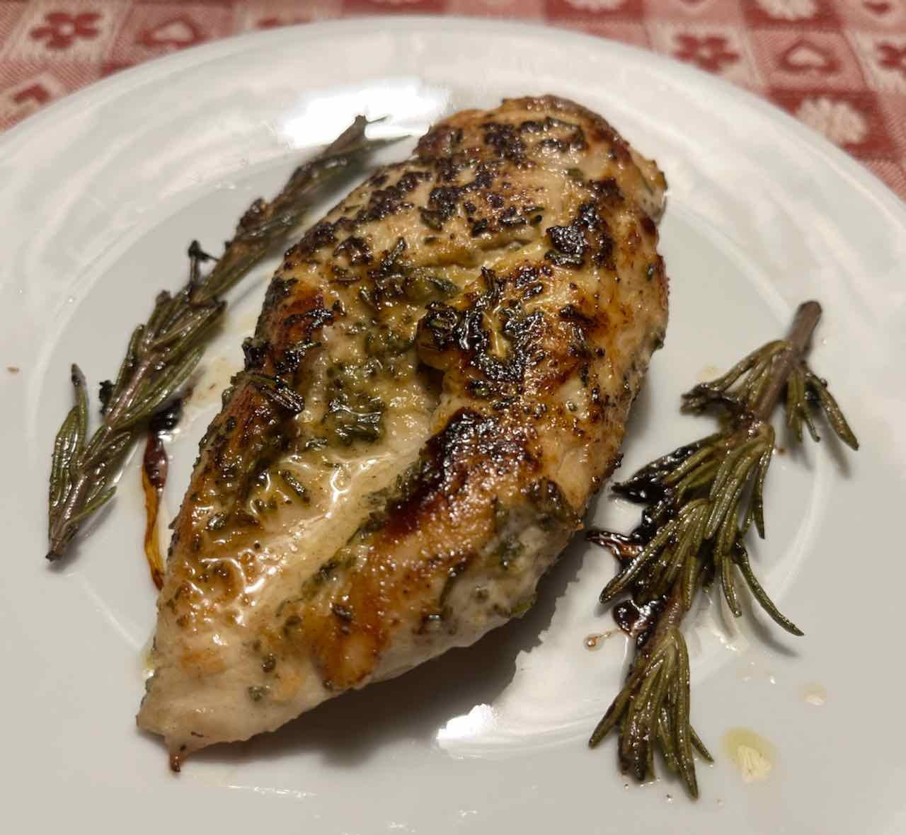 Vorspeise Champignons spanisch mit Knoblauch in Olivenöl gebraten und mit sanftem weißem Balsamico abgelöscht, Hauptgerichte Bio-Hähnchenfilet französisch mit Rosmarin, Knoblauch, Olivenöl, Dijonsenf und Honig mariniert und mit Olivenöl, Butter, Knoblauch und Rosmarin gebraten und mit Portwein abgelöscht sowie Rosmarinkartoffeln gedämpft zur Giesinger "Freiheit"