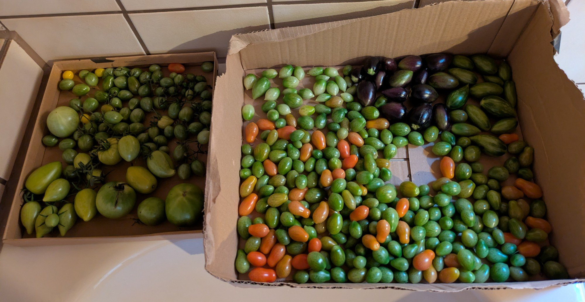 Einiges an Kleine Dänin aus dem STP und Sunviva: Fioline, Brad's Atomic Grape, Artisan Green Tiger, ein paar Barry's Crazy Cherry und Ildy im großen Karton, ein paar gemischte im kleinen: Von den Sorten mit großen Früchten haben es leider keine mehr geschafft, deswegen wird es wohl nur noch 2-3 mal Salat mit Fetakäse geben, dafür werden die Kinder noch etwas zum Naschen haben.
