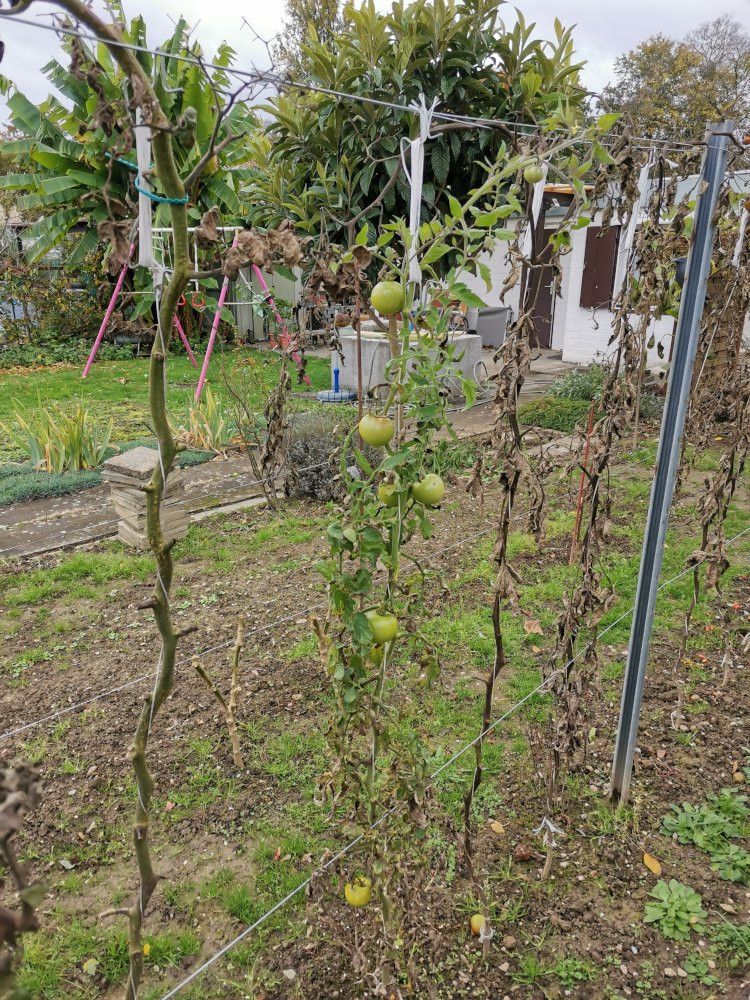 Bei mir ist jetzt auch endgültig Schluss. Am längsten durchgehalten haben eine Kirschtomate, eine John Maynard und eine Fablonelsky. Aber die jetzt so blassgrün Abgemachten werden nicht mehr rot, faulen eher weg. Ich hau sie in die Suppe, auch grüne Tomaten kann man essen (natürlich bevor sie faulen).