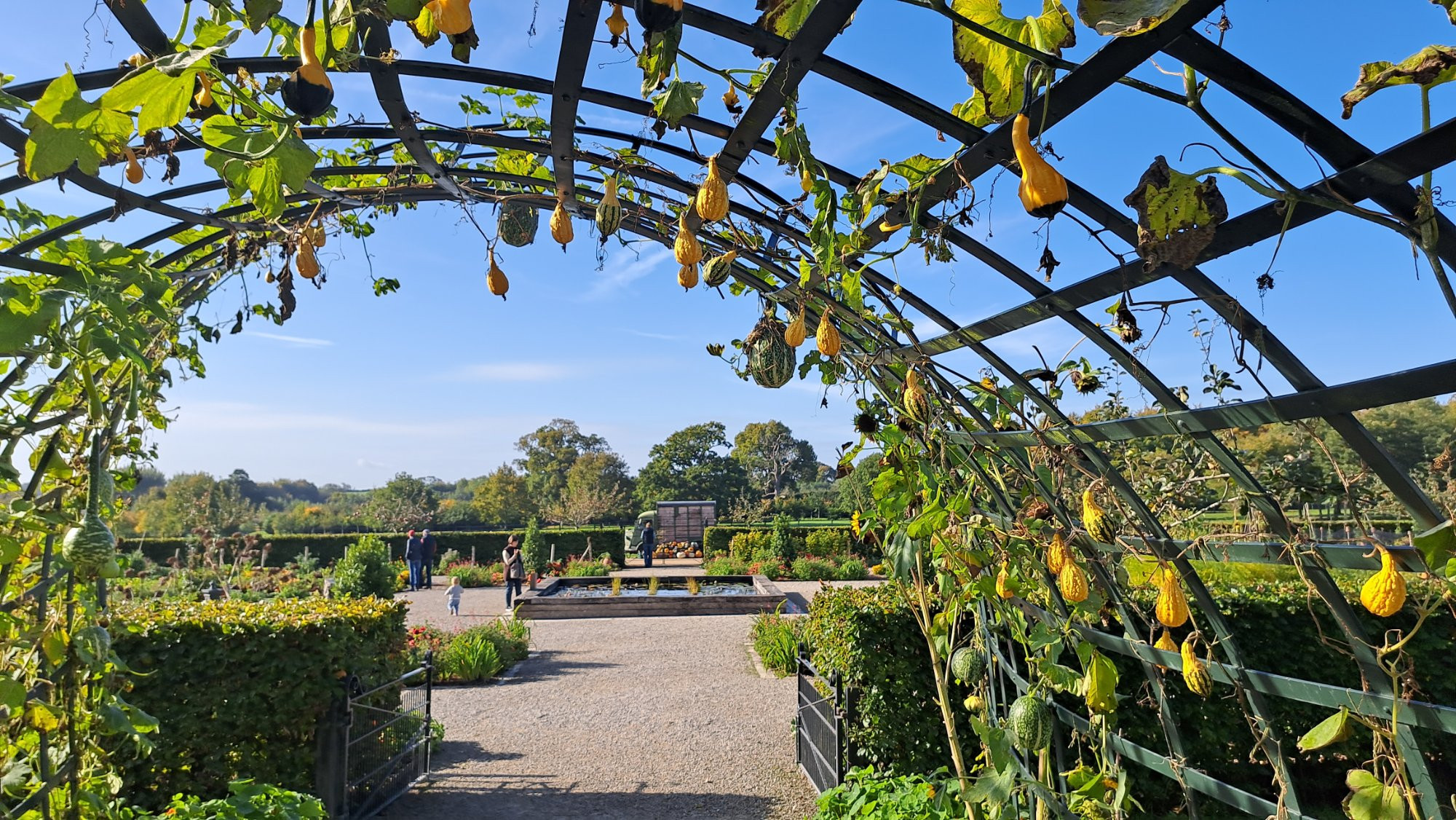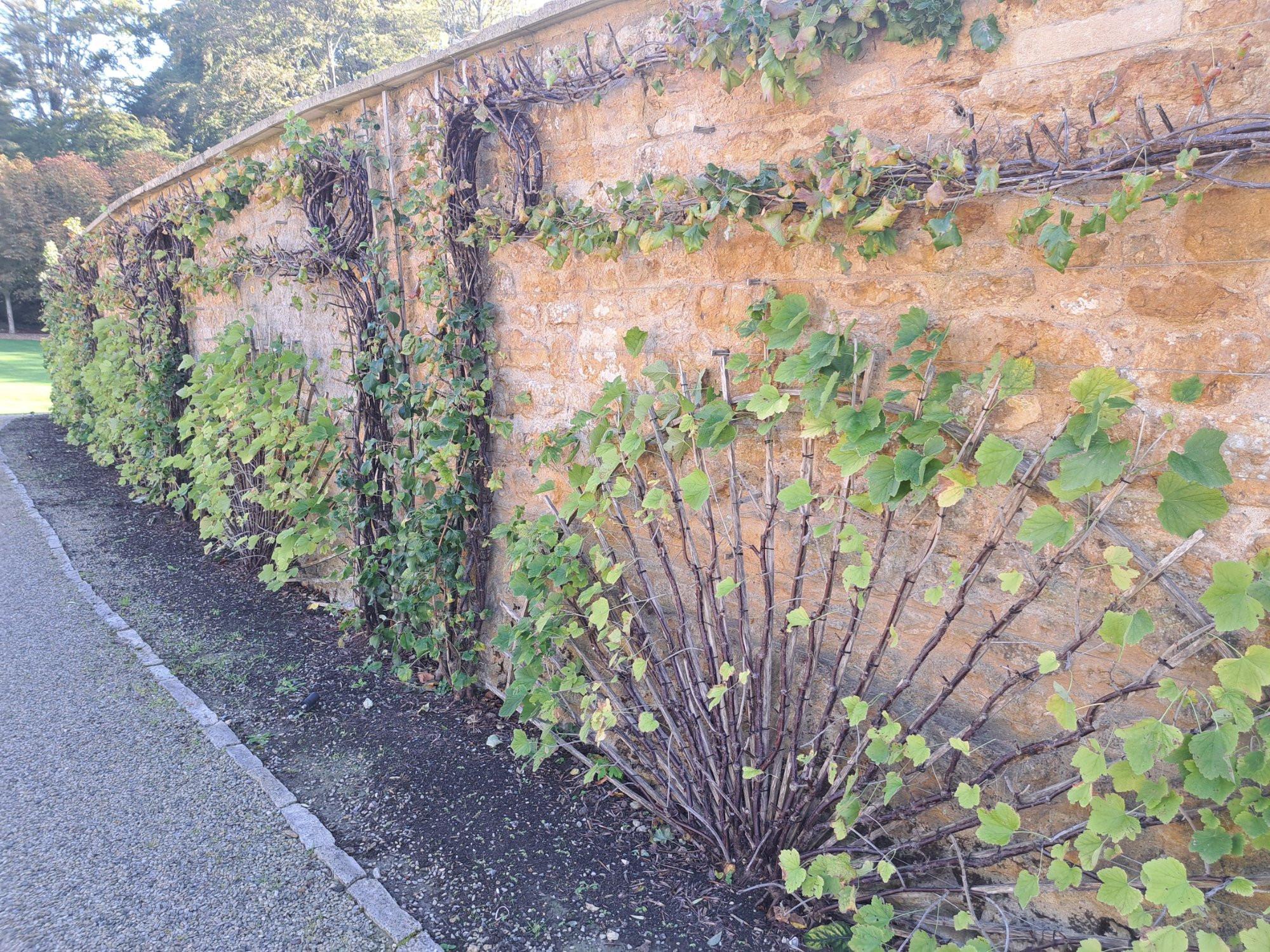 Johannisbeeren und Wein im Spalier gezogen. Hmmm, schade, von den weißnichtwievielhundert verschiedenen (einheimischen) Apfelsorten, sortiert nach Region, hab ich gar kein richtiges Foto. Alle in schmalen Spalieren, manche Spaliere hüfthoch gehalten, andere höher und im Bogen.