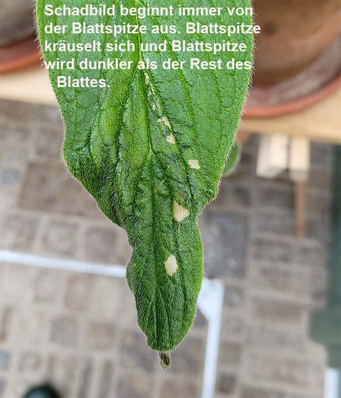 Erstes Bild: Blattkante eingezogen, ohne für mich sichtbarem Schädlingsbefall