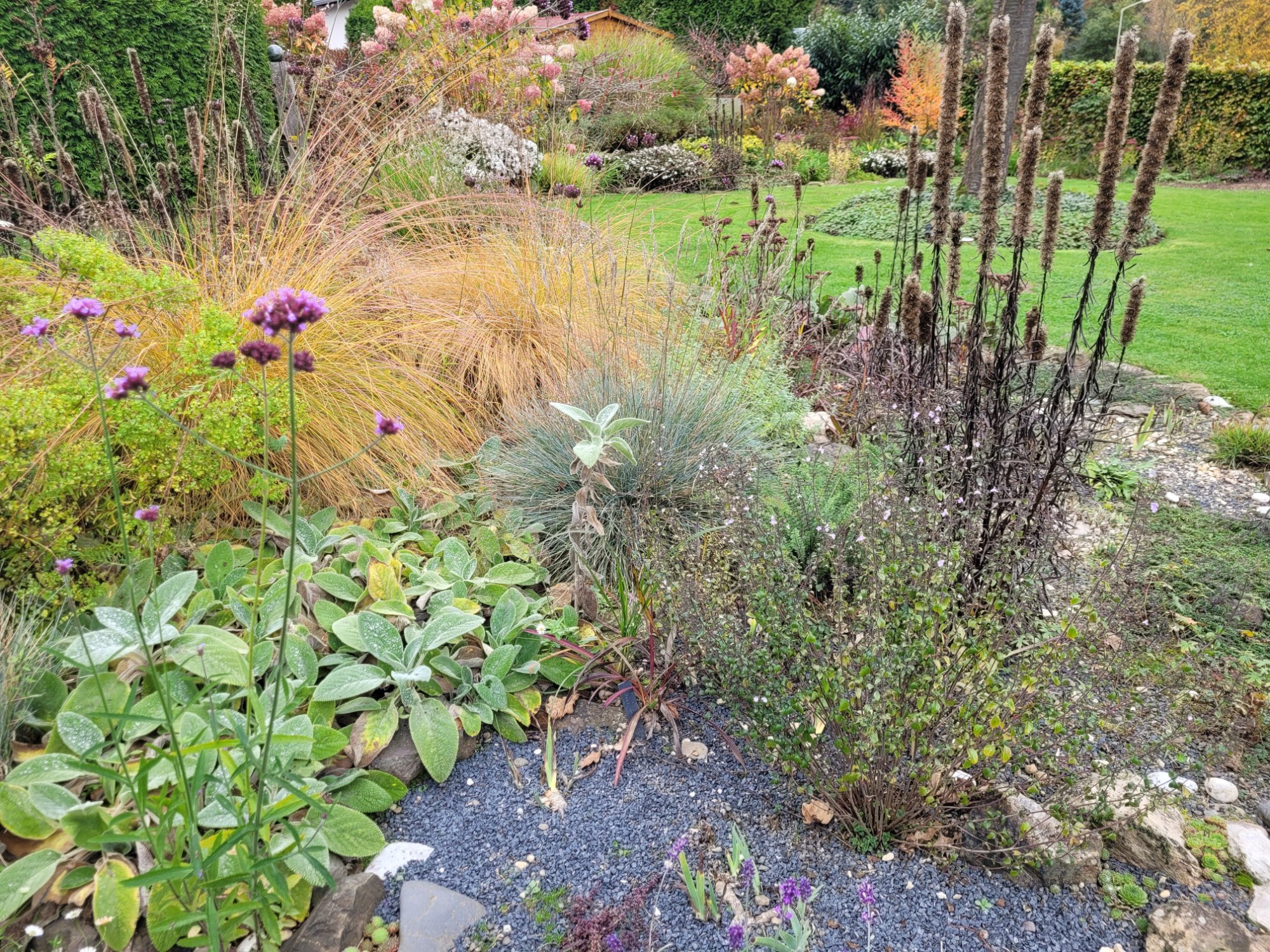 Die neu im vorigen und in diesem Jahr gesetzten Gräser haben noch ihr graugrünes Kleid. Vielleicht liegt es ja auch daran, daß es ihnen im sandig/ schottrigen Boden/ Lehmgemisch einfach besser gefällt. ;D