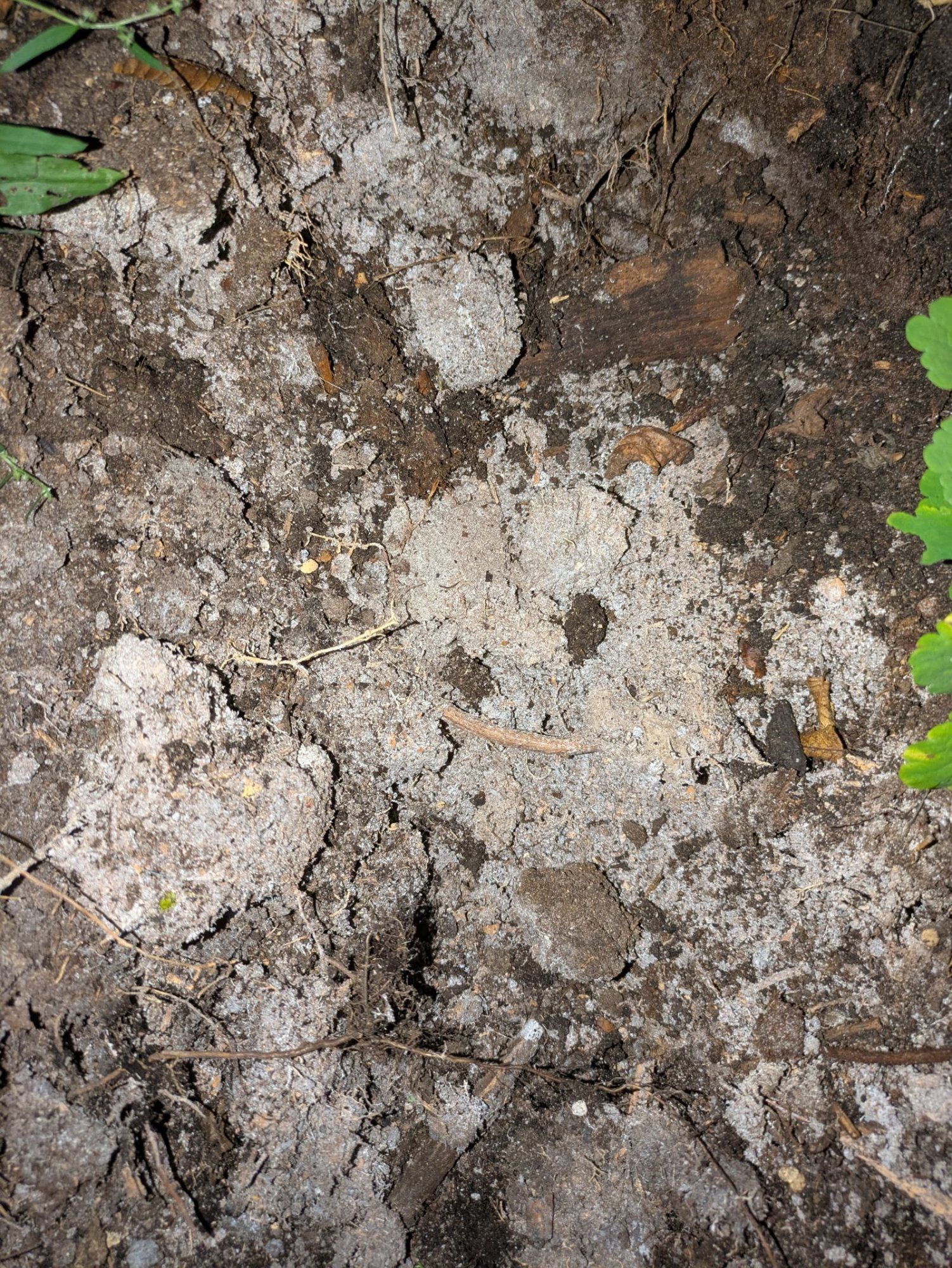 Unterm großen, alten Feldahorn sah es teilweise bei neuen Pflanzlöchern so aus, als ob der mineralische Lehm mit Puderzucker bestäubt wäre, alles Myzel.
