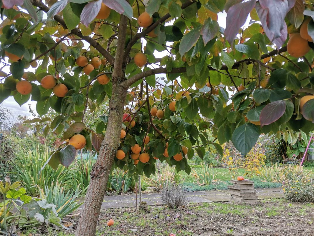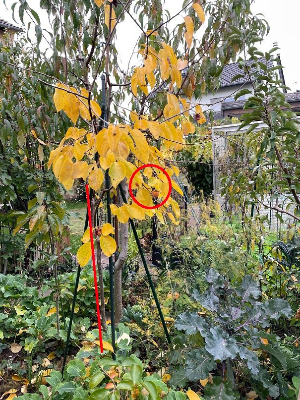 Je nach Frucht war eine leichte Adstringends zu schmecken, aber kein Rumgeschmack o.ä.. Sie hatten Kerne, vermutlich wurden sie von der Kaki Pendula bestäubt, da konnte ich wenige männliche Blüten im Sommer entdecken. Die Bätter sind schon gelb bzw. abgefallen. Tatsächlich eine frührere Sorte. Toll, nach so vielen Jahren mal ein Kaki Erfolg. Eine empfehlenswerte Sorte (für meinen Standort).