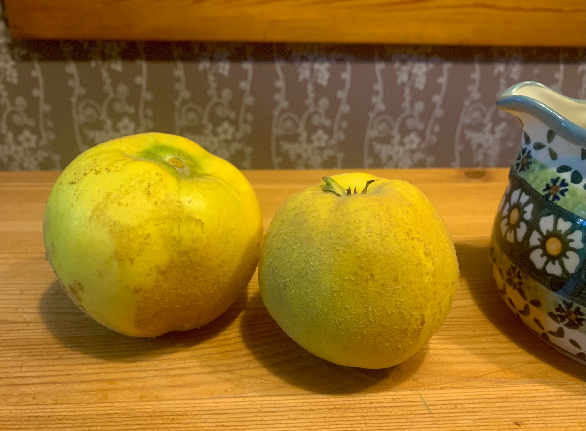 Ich habe soeben Quittenmarmelade gekocht. Die Früchte stammen von einer wurzelechten unbekannten rundfrüchtigen Sorte. Sie sind erheblich aromatischer als die optisch beeindruckenden Portugieser Birnenquitten.