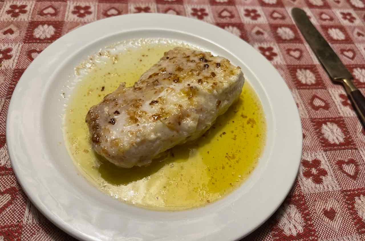 Vorspeise gratinierter Lachs, Hauptgerichte Kabeljau Loins mit Butter, etwas Olivenöl und Limettensaft gebraten sowie Gnocchetti sardi aglio e olio zum Riesling 2024 aus der Pfalz