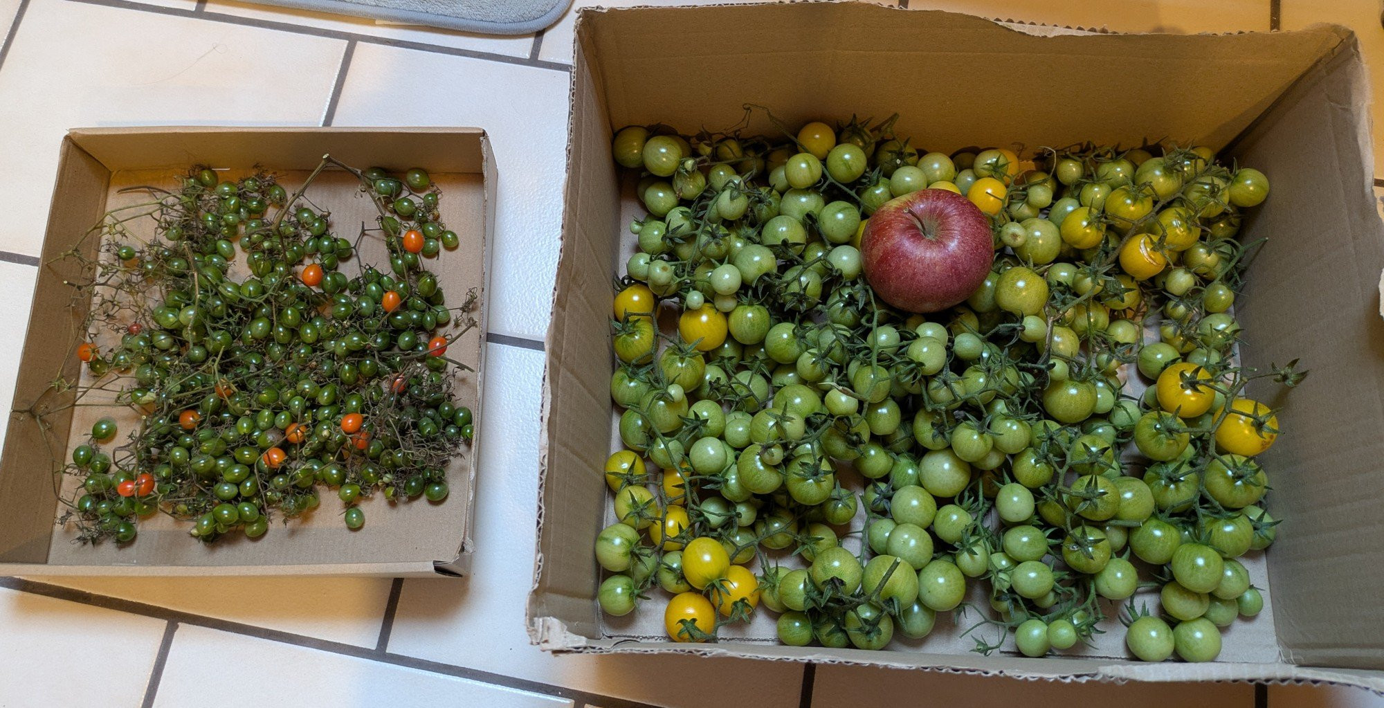 Einiges an Kleine Dänin aus dem STP und Sunviva: Fioline, Brad's Atomic Grape, Artisan Green Tiger, ein paar Barry's Crazy Cherry und Ildy im großen Karton, ein paar gemischte im kleinen: Von den Sorten mit großen Früchten haben es leider keine mehr geschafft, deswegen wird es wohl nur noch 2-3 mal Salat mit Fetakäse geben, dafür werden die Kinder noch etwas zum Naschen haben.