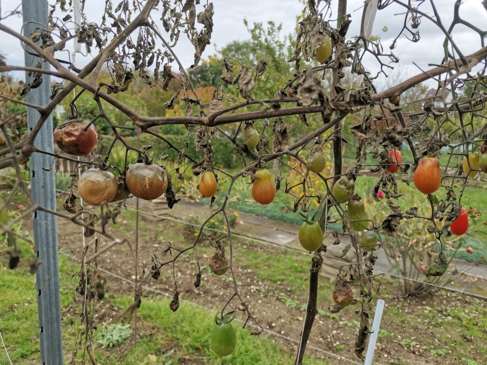 Bei mir ist jetzt auch endgültig Schluss. Am längsten durchgehalten haben eine Kirschtomate, eine John Maynard und eine Fablonelsky. Aber die jetzt so blassgrün Abgemachten werden nicht mehr rot, faulen eher weg. Ich hau sie in die Suppe, auch grüne Tomaten kann man essen (natürlich bevor sie faulen).
