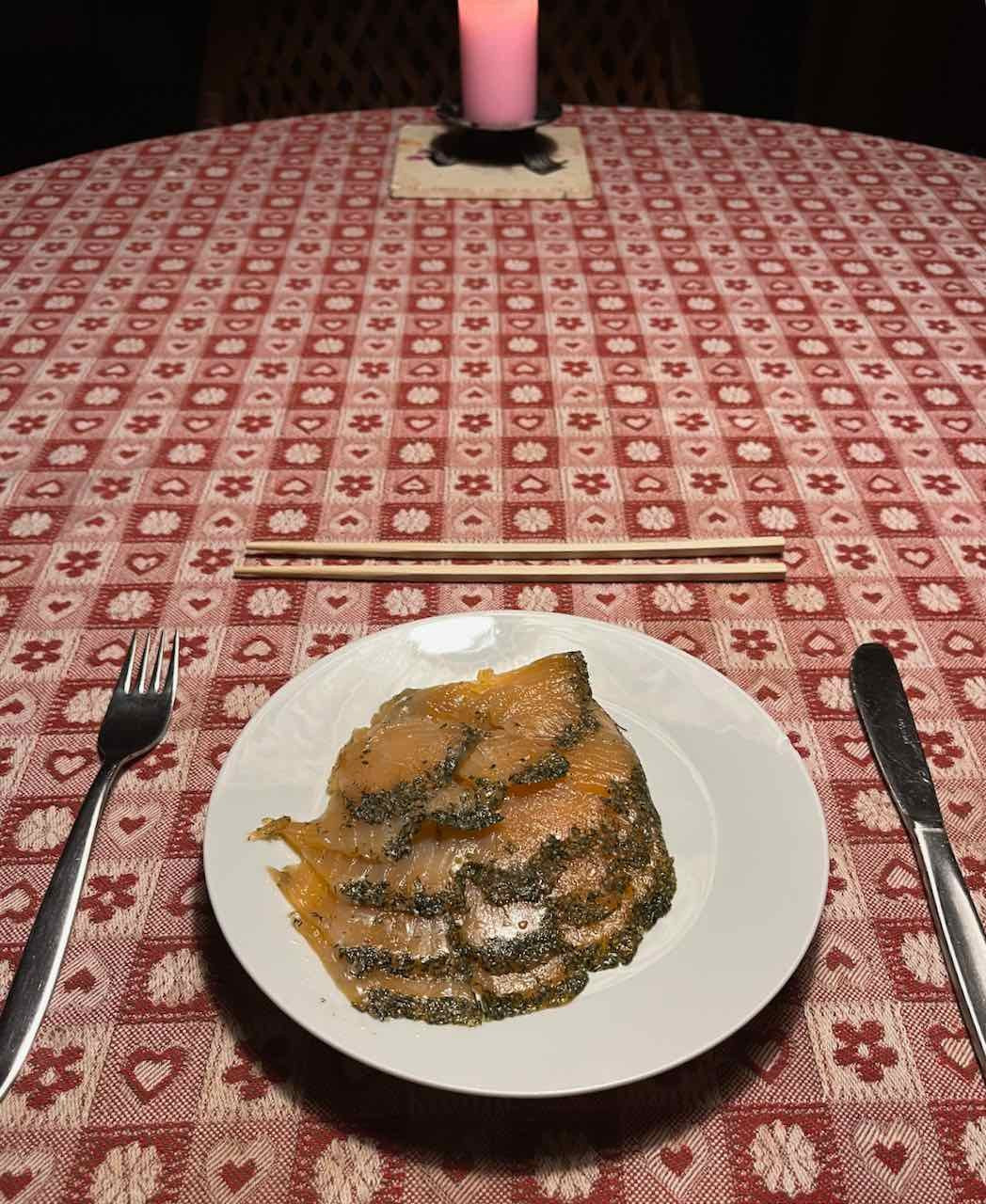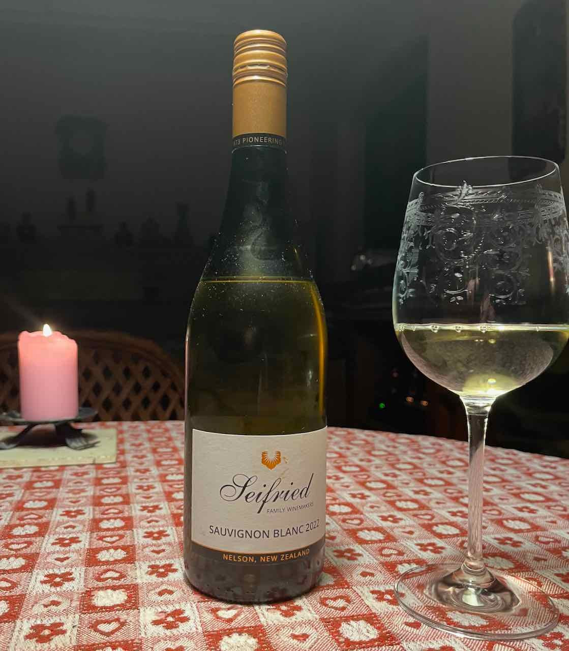 Vorspeise Räucherlachs, Hauptgerichte dünne Glasnudeln mit Black-Tiger-Garnelen, Frühlingszwiebeln, Austernpilzen, Kirschtomaten, Knoblauch, Chili und Ingwer sowie mit Olivenöl, Sojasoße, Austernsoße und etwas Sesamöl gebraten zum Sauvignon blanc 2022 "Seifried" aus Neuseeland.