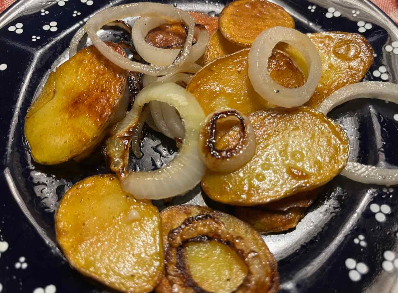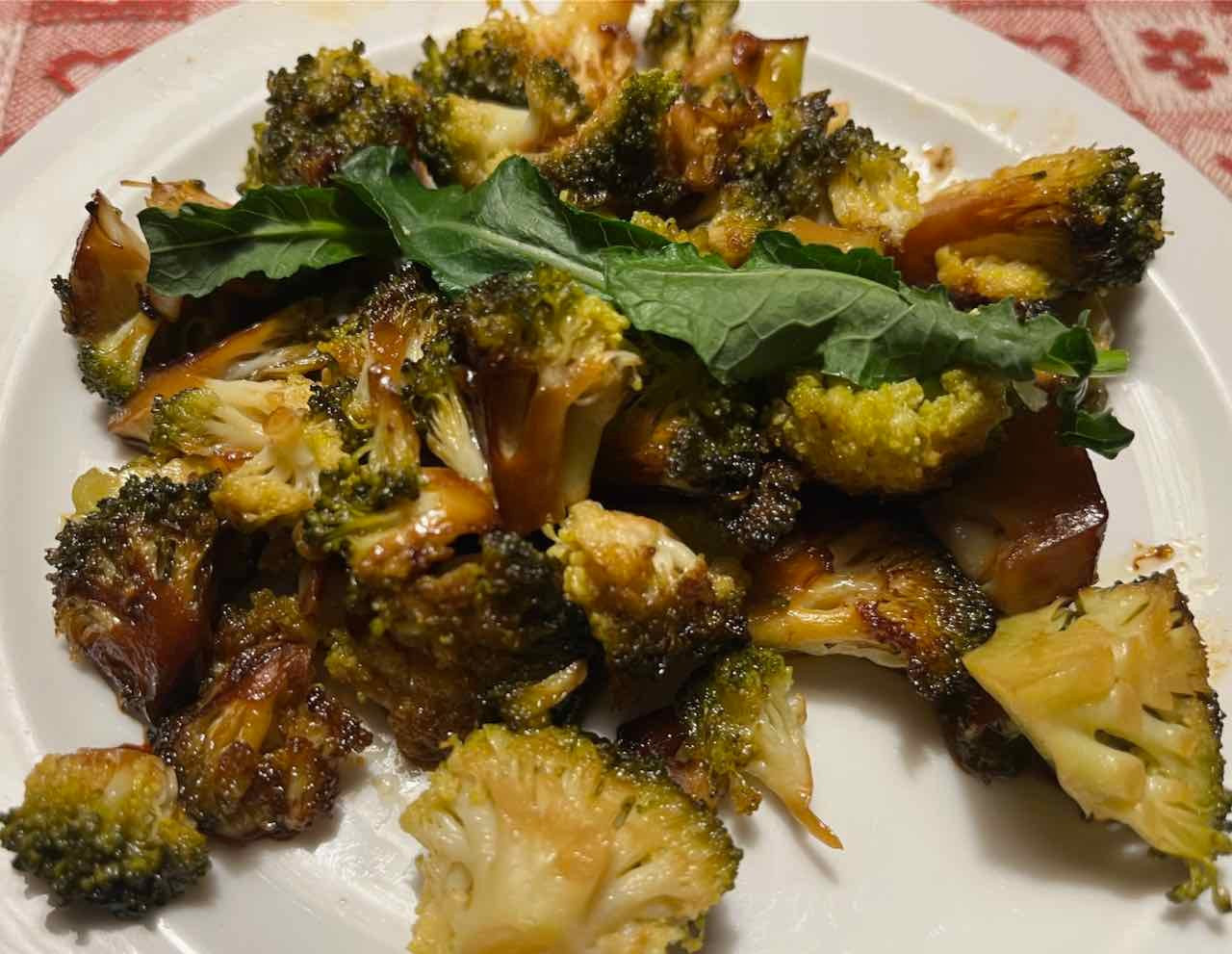 Brokkoli mit Olivenöl, Butter, Sojasoße, Balsamico und Knoblauch gebraten sowie schnelle Bratkartoffeln mit weißer Zwiebel zum Pinot blanc "Black Forest" aus Baden