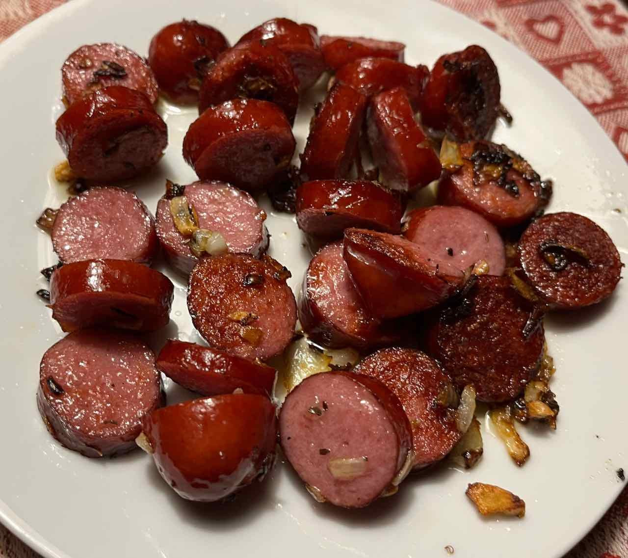 Kabanos in Scheiben mit Zwiebeln und Knoblauch gebraten und mit Basilikum und Oregano gewürzt sowie Sauerkraut, indisch mit Curry, Kreuzkümmel und Zimt gewürzt und über Portweinschorle gedämpft zum Franziskaner Weißbier alkoholfrei