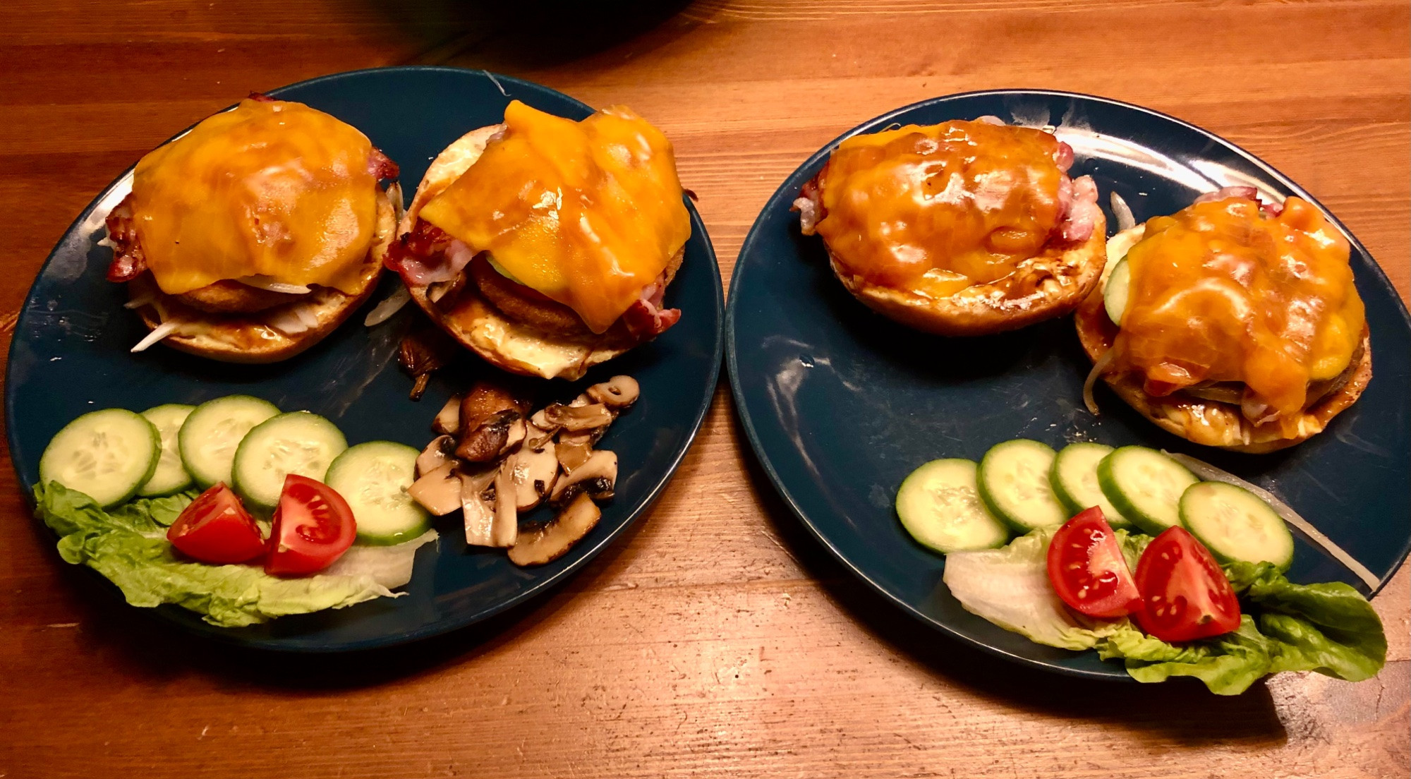 Heute gab es Burger und da die immer so schwierig zu essen sind, belege und überbacke ich beide Hälften. Der Mann hatte Rindfleisch, ich vegetarische Patties :)