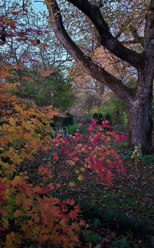 Zum Glück hatte ich noch eine Nahaufnahme vom kleinen 'Dissectum Garnet' gemacht, schon ein paar Tage später pustete der Sturm die Hälfte des Laubs davon, der kleine Kerl wächst wirklich langsam, er ist bereits 7 Jahre alt, aber gerade einmal kniehoch. Aber er zeigt sich erstaunlich robust, verträgt auch im Sommer glühende Hitze ohne Klagen, und nur ganz gelegentlich bekommt er mal eine Kanne Wasser, wenn es gar zu trocken ist. 'Orange Dream' am Gartenhaus hat nun wieder sein orangefarbenes Herbstkleid angelegt, mit 8 Jahren ist er mittlerweile gut 2,5 m hoch, dabei aber bisher schön schlank geblieben. Die gleichzeitig gepflanzte Felsenbirne ist gut doppelt so hoch und beschattet im Sommer wie geplant das etwas empfindliche Laub.