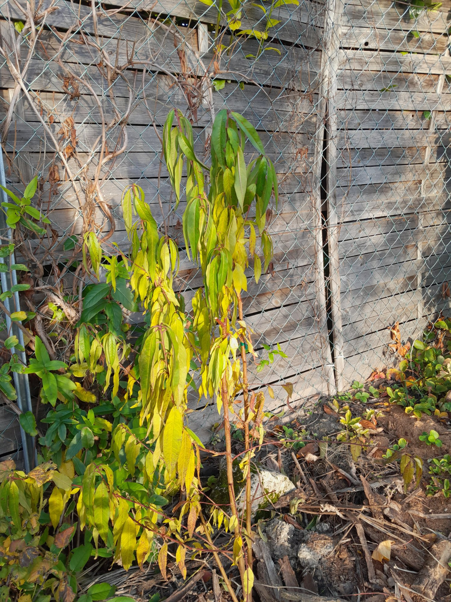 Es ist eh zu überlegen, ob man einen Stamm oder einen Strauch haben möchte. So dicht am Zaun ist beides nicht optimal.