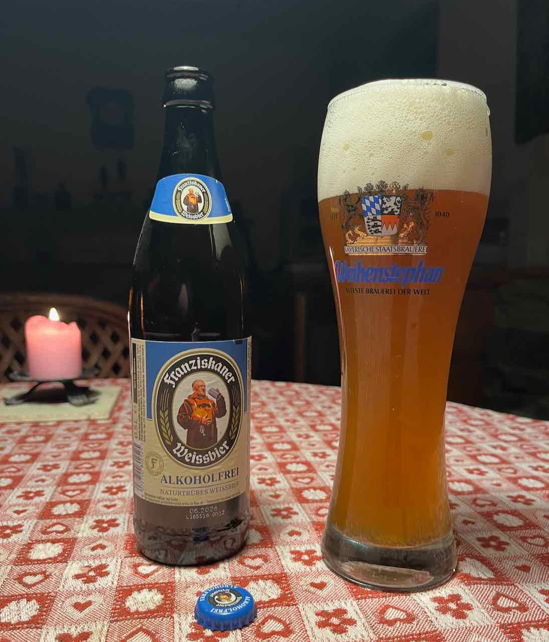 Kabanos in Scheiben mit Zwiebeln und Knoblauch gebraten und mit Basilikum und Oregano gewürzt sowie Sauerkraut, indisch mit Curry, Kreuzkümmel und Zimt gewürzt und über Portweinschorle gedämpft zum Franziskaner Weißbier alkoholfrei