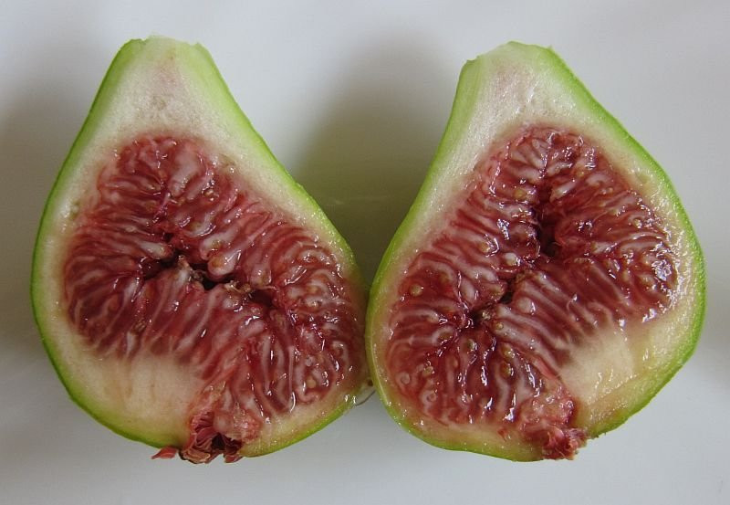 Und hier die Frucht (war wohl zu früh geerntet, auch wenn die Nadelprobe unauffällig war, ist Milchsaft nach dem Ernten ausgetreten und die Feige hat eher grasig geschmeckt; allerdings steht die Pflanze auch schon eine Weile drinnen, damit ich eine Probierfrucht bekomme):