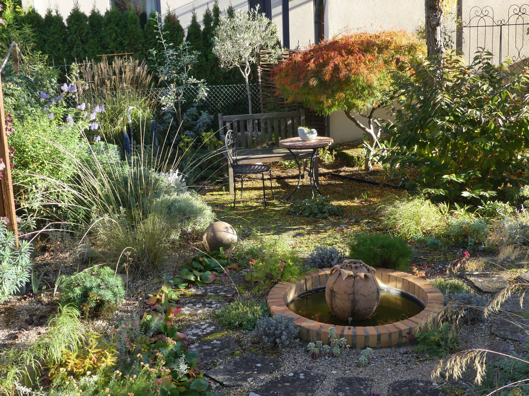 Hier zeigt mir der Blick durchs Küchenfenster, daß nun auch Acer Dissectum 'Garnet ' langsam den Herbstturbo anwirft. Aber das ist ja noch lange nicht alles, da geht noch einiges mehr.