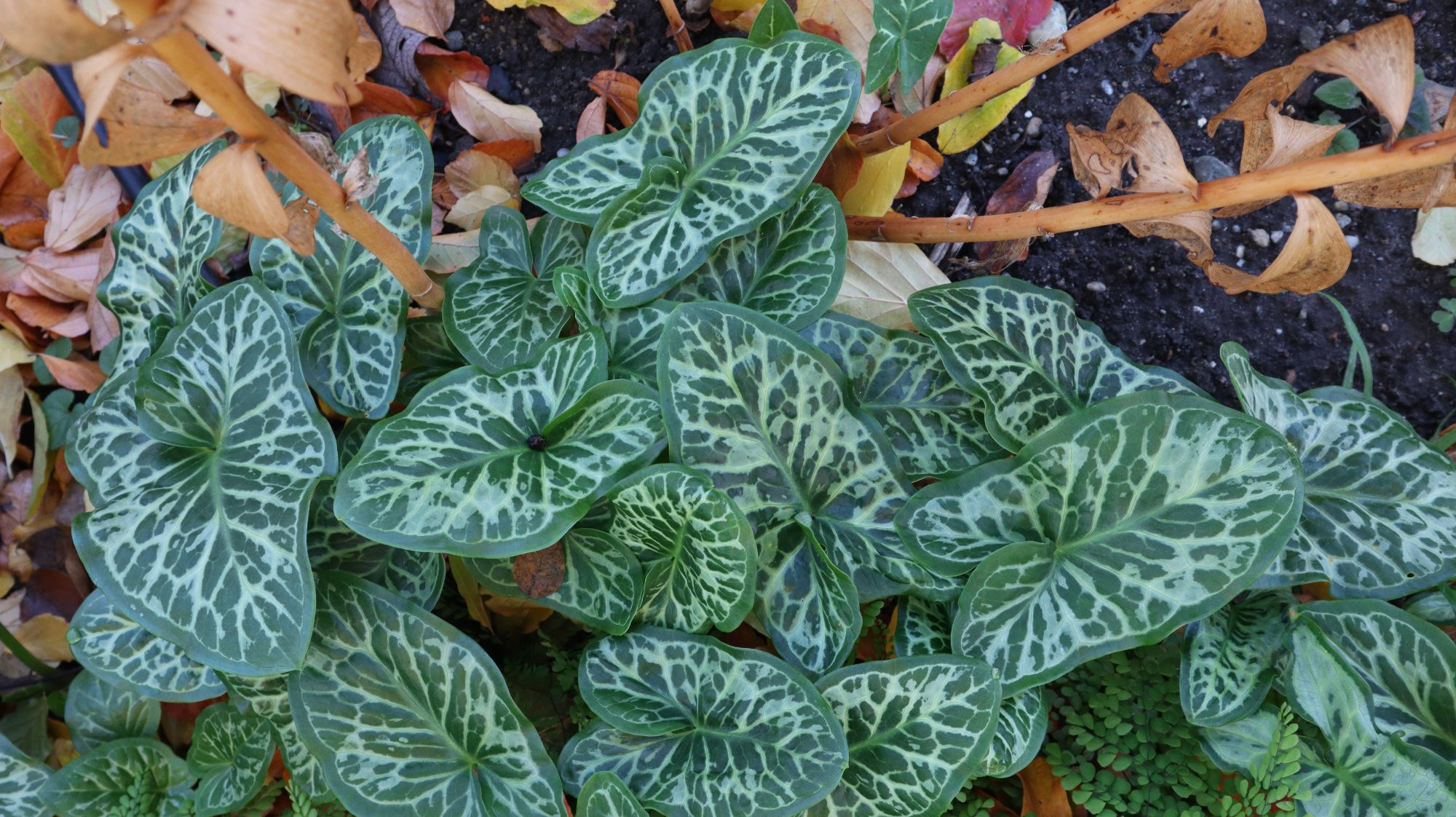 Ja, die Hybriden haben gewöhnlich den herbstlichen Austrieb von Arum italicum geerbt und manchmal auch schwarze Zeichnung von Arum maculatum. Die ist dann aber gewöhnlich nicht so tief eingesunken im Blatt wie bei unserem einheimischen Aronstab. Mich hatte überrascht, dass ´Chamaeleon´wohl auch eine Hybride ist - da hätte ich das auf den ersten Blick nicht vermutet.