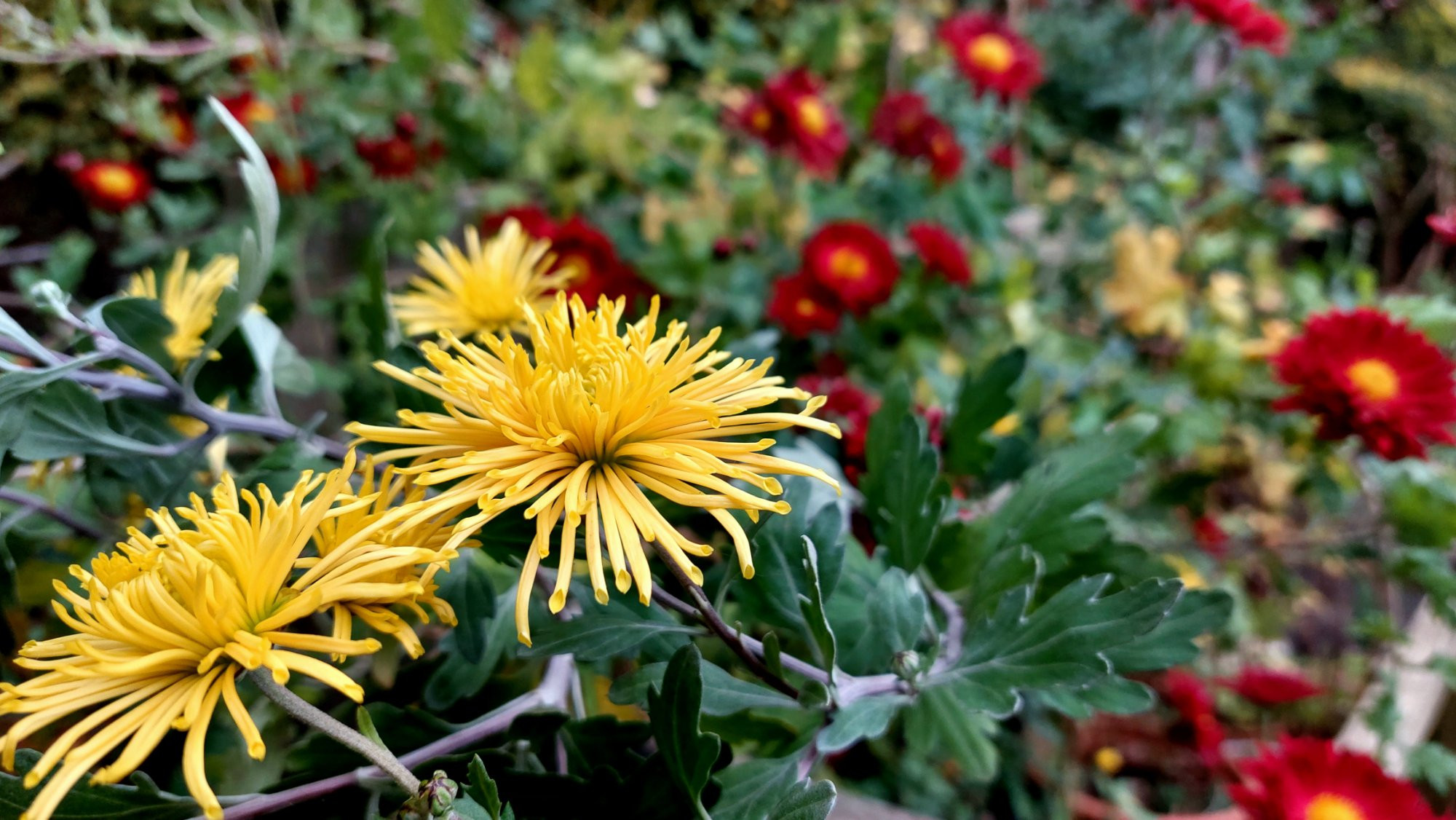 Hier ist es kalt und nass, die Chrysanthemen hängen etwas über oder sind umgeweht vom Sturm letzte Woche.