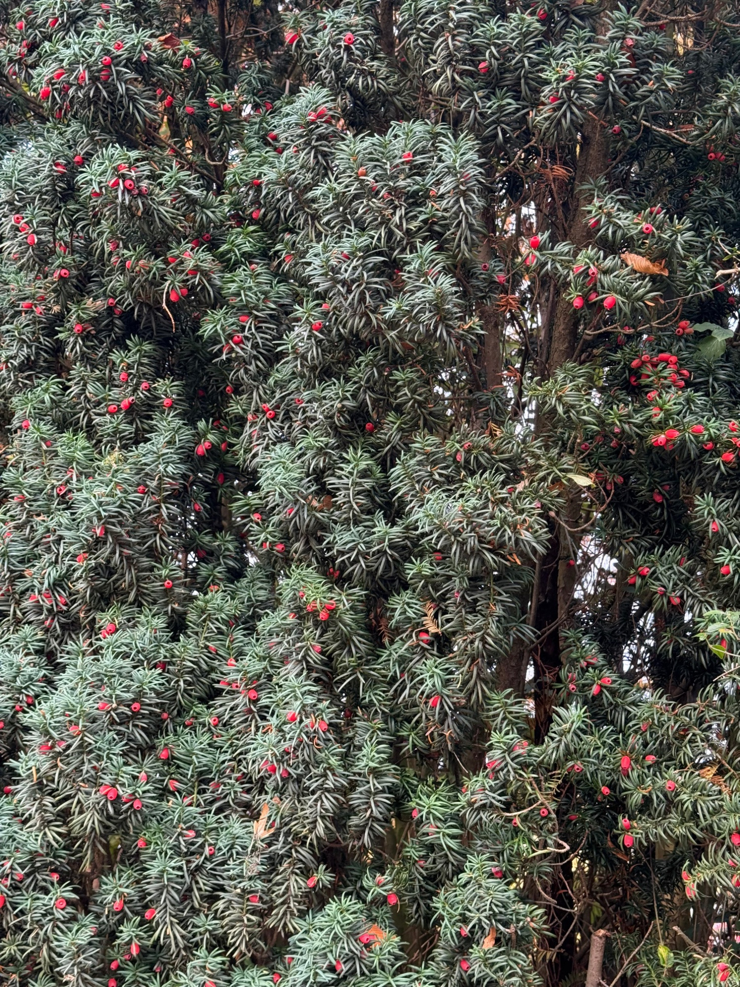 Der Fruchtschmuck der Eiben ist doch nett und erinnert entfernt an einen geschmückten Weihnachtsbaum – insbesondere die säulenförmigen Auslesen.