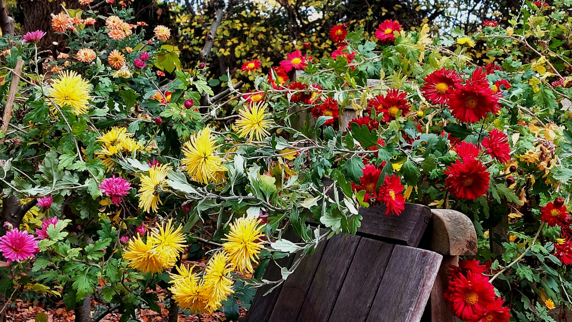 Ein paar Szenen aus dem Chrysanthemengarten heute : C. `Lisa´ , C. `Oktoberpracht ´und C. `Nebelrose ´, C. `Feuerzauber ´u. C.